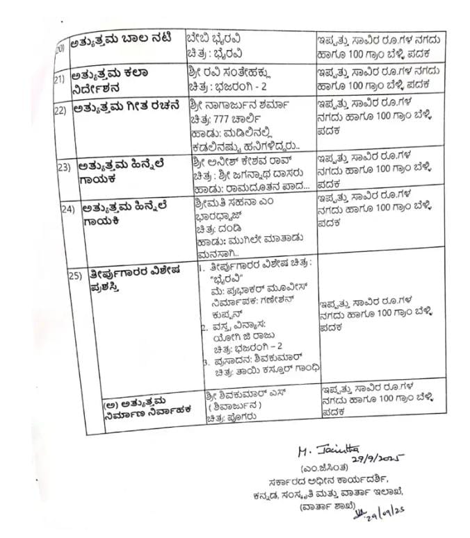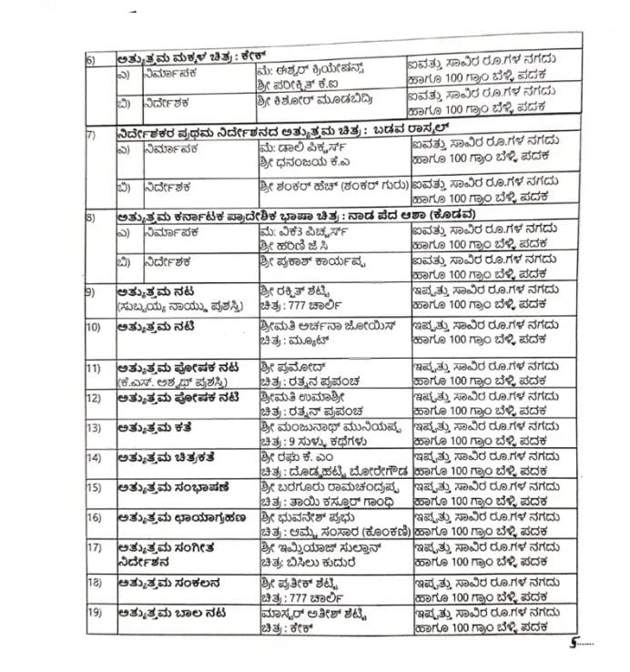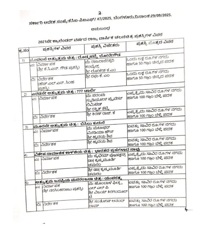 ‘ದೊಡ್ಡಹಟ್ಟಿ ಬೈರೇಗೌಡ’ ಚಿತ್ರಕ್ಕೆ ಅತ್ಯುತ್ತಮ ಮೊದಲ ಚಿತ್ರ, ‘ಯುವರತ್ನ’ಕ್ಕೆ ಅತ್ಯುತ್ತಮ ಮನರಂಜನಾ ಚಿತ್ರ ಪ್ರಶಸ್ತಿಗೆ ಆಯ್ಕೆ ಆಗಿದೆ. ‘ರತ್ನನ್ ಪ್ರಪಂಚ’ ಚಿತ್ರದ ಅಭಿನಯಕ್ಕಾಗಿ ಪ್ರಮೋದ್ ಅವರಿಗೆ ಅತ್ಯುತ್ತಮ ಪೋಷಕ ನಟ ಪ್ರಶಸ್ತಿ, ಉಮಾಶ್ರಿ ಅವರಿಗೆ ಅತ್ಯುತ್ತಮ ಪೋಷಕ ನಟಿ ಪ್ರಶಸ್ತಿ, ‘ಕೇಕ್’ ಚಿತ್ರದ ನಟನೆಗಾಗಿ ಮಾಸ್ಟರ್ ಅತೀಶ್ ಶೆಟ್ಟಿಗೆ ಅತ್ಯುತ್ತಮ ಬಾಲನಟ ಪ್ರಶಸ್ತಿ ಲಭಿಸಿದ್ದರೇ, ‘ಭೈರವಿ’ ಚಿತ್ರದ ಅಭಿನಯಕ್ಕಾಗಿ ಬೇಬಿ ಭೈರವಿಗೆ ಅತ್ಯುತ್ತಮ ಬಾಲನಟಿ ಪ್ರಶಸ್ತಿ ನೀಡಲಾಗಿದೆ.