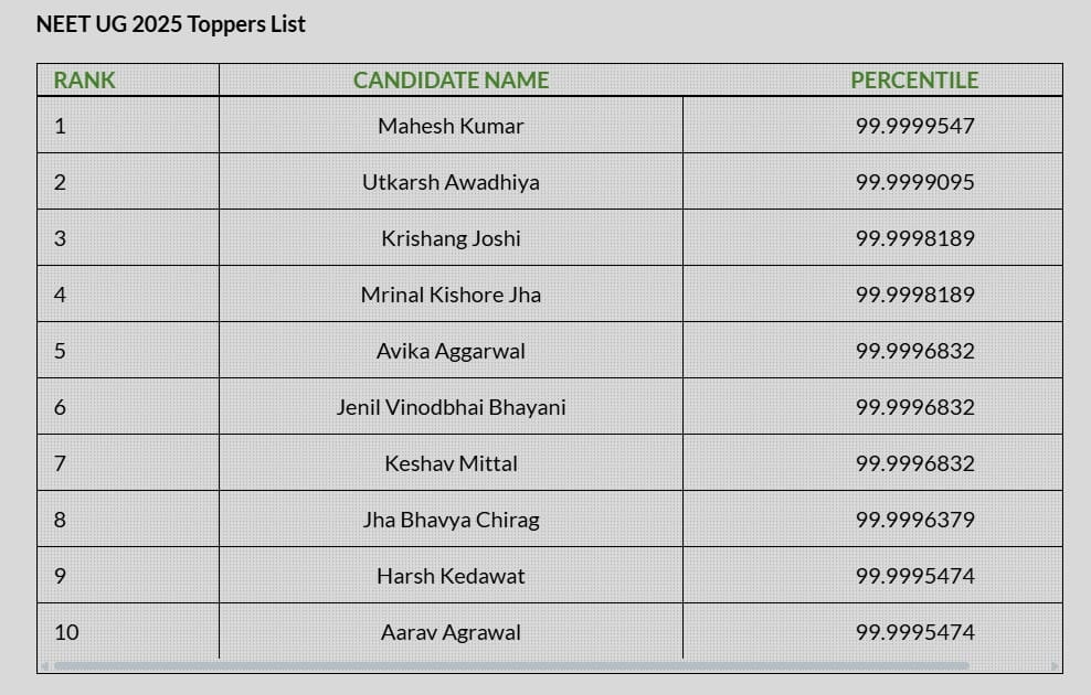 NEET UG 2025: ರಾಷ್ಟ್ರೀಯ ಪರೀಕ್ಷಾ ಸಂಸ್ಥೆ (ಎನ್ಟಿಎ) ನೀಟ್ ಯುಜಿ 2025 ಪರೀಕ್ಷೆಯ ಟಾಪ್ 100 ಅಭ್ಯರ್ಥಿಗಳ ಪಟ್ಟಿಯನ್ನು ಬಿಡುಗಡೆ ಮಾಡಿದೆ, ಇದರಲ್ಲಿ ರಾಜಸ್ಥಾನದ ಮಹೇಶ್ ಕುಮಾರ್ 99.9999547 ಶೇಕಡಾವಾರು ಅಂಕಗಳೊಂದಿಗೆ ಅಗ್ರಸ್ಥಾನ ಪಡೆದಿದ್ದಾರೆ. ಮಧ್ಯಪ್ರದೇಶದ ಉತ್ಕರ್ಷ್ ಅವಧಿಯಾ ಪಟ್ಟಿಯಲ್ಲಿ ಎರಡನೇ ಸ್ಥಾನದಲ್ಲಿದ್ದಾರೆ. ಅವರ ನಂತರ ಮಹಾರಾಷ್ಟ್ರದ ಕೃಶಾಂಗ್ ಜೋಶಿ ಮತ್ತು ದೆಹಲಿಯ (ಎನ್ಸಿಟಿ) ಮೃಣಾಲ್ ಕಿಶೋರ್ ಝಾ ಇದ್ದಾರೆ.