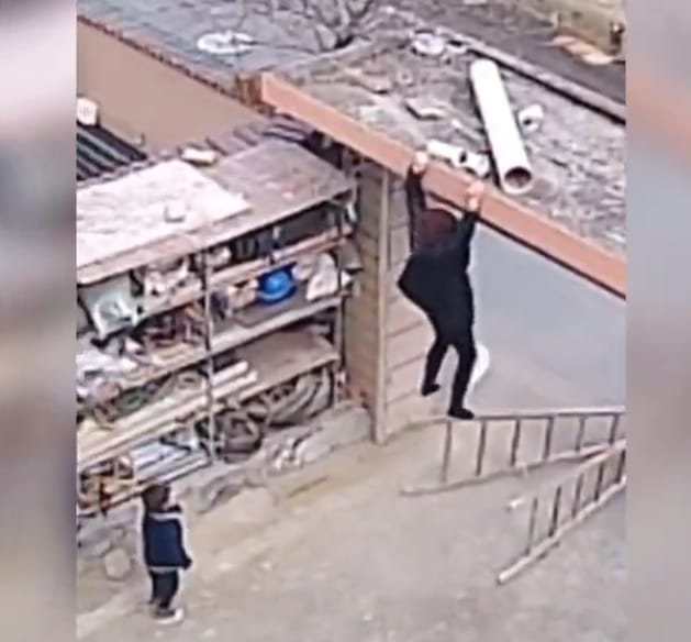 ತಾಯಿ ಟೆರೀಸ್ನಲ್ಲಿರುವ ಬಾಗಿಲನ್ನು ರಿಪೇರಿ ಮಾಡುತ್ತಿದ್ದಾಗ ಅವಳ ಏಣಿ ಏಕಾಏಕಿ ಬಿದ್ದಿದ್ದು, ಆಗ ತಾಯಿ ಕಿರುಚಿಕೊಂಡಿದ್ದಾಳೆ. ತಾಯಿ ನೇತಾಡುತ್ತಿರುವುದನ್ನು ನೋಡಿ, ಧೈರ್ಯಶಾಲಿ ಬಾಲಕ ಕೂಡಲೇ ಸಹಾಯಕ್ಕೆ ಧಾವಿಸಿ ಏಣಿಯನ್ನು ಮೇಲೆತ್ತಿ ತನ್ನ ತಾಯಿಯ ಬಳಿ ಇರಿಸಿದನು, ನಂತರ ಅವಳು ತನ್ನ ಕಾಲುಗಳಿಂದ ಏಣಿಯನ್ನು ಹಿಡಿಯುವಲ್ಲಿ ಯಶಸ್ವಿಯಾಗಿದ್ದಲ್ಲದೆ ಆಕೆಯನ್ನು ಪ್ರಾಣಾಪಾಯದಿಂದ ಪಾರು ಮಾಡಿದ ವಿಡಿಯೋ ಇದಾಗಿದೆ.