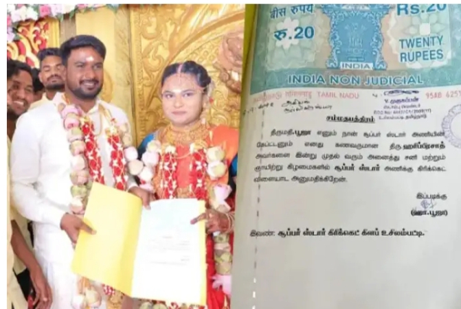 ಮದುವೆ ಬಳಿಕ ಎಲ್ಲ ಶನಿವಾರ ಮತ್ತು ಭಾನುವಾರದಂದು ಸೂಪರ್ ಸ್ಟಾರ್ ತಂಡಕ್ಕಾಗಿ ಕ್ರಿಕೆಟ್ ಆಡಲು ಪತಿಗೆ ಅನುಮತಿ ನೀಡುತ್ತೇನೆ ಎಂದು ವಧುವಿನಿಂದ ಸ್ನೇಹಿತರು ಬಾಂಡ್ ಪೇಪರ್‌ನಲ್ಲಿ ಸಹಿ ಹಾಕಿಸಿಕೊಂಡಿದ್ದಾರೆ.
