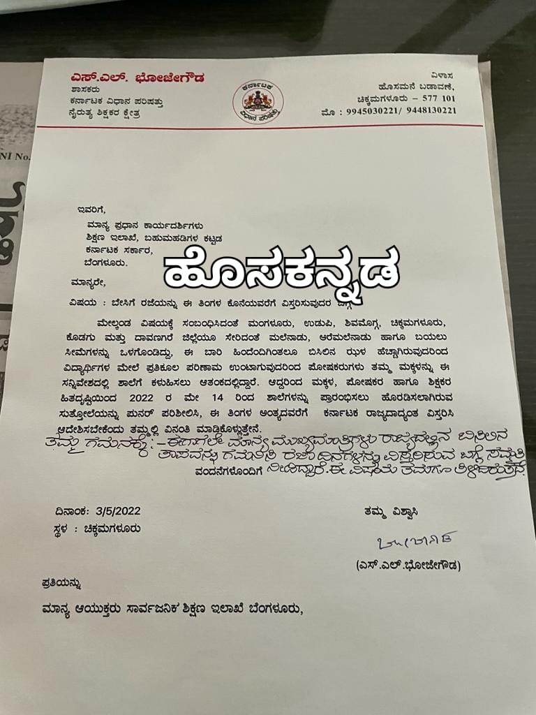 ವಾತಾರವರಣದಲ್ಲಿ ಬಿಸಿಲಿನ ತಾಪ ಹೆಚ್ಚಿರುವುದರಿಂದ ಈಗಾಗಲೇ ಶಾಲಾ ಕಾಲೇಜುಗಳ ಆರಂಭಕ್ಕೆ ಮೇ 14ರಂದು ದಿನ ನಿಗದಿ ಮಾಡಲಾಗಿರುವುದನ್ನು ವಿಸ್ತರಿಸಬೇಕೆಂದು ವಿಧಾನಪರಿಷತ್ ಸದಸ್ಯ ಎಸ್.ಎಲ್ ಭೋಜೇಗೌಡ ಸರ್ಕಾರಕ್ಕೆ ಮನವಿ ಸಲ್ಲಿಸಿದ್ದಾರೆ.
