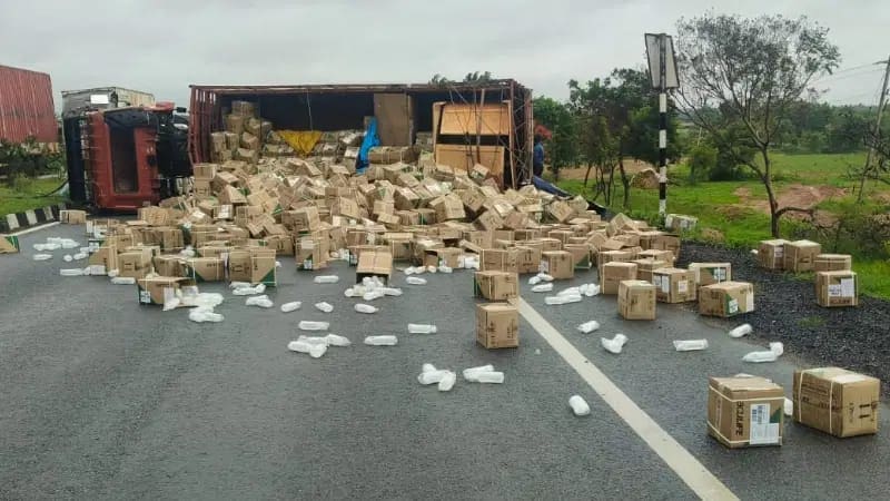 ಔಷಧಿ ತುಂಬಿದ ಲಾರಿ ಗುಜರಾತ್ನ ಅಹಮಾಬಾದ್ನಿಂದ ಬೆಂಗಳೂರಿಗೆ ಹೊರಟಿದ್ದು, ಈ ವೇಳೆ ಚಾಲಕ ನಿದ್ದೆ ಮಂಪರಿನಲ್ಲಿ ಲಾರಿ ಚಲಾಯಿಸುತ್ತಿದ್ದು, ಡಿವೈಡರ್ಗೆ ಡಿಕ್ಕಿ ಹೊಡೆದಿರುತ್ತಾನೆ. ಪರಿಣಾಮ ಲಾರಿ ಪಲ್ಟಿಯಾಗಿ ಔಷಧ ತುಂಬಿದ್ದ ಬಾಕ್ಸ್ಗಳು ಚೆಲ್ಲಾಪಿಲ್ಲಿಯಾಗಿರುವುದರಿಂದ ಲಕ್ಷಾಂತರ ಮೌಲ್ಯದ ಔಷಧ ಮಣ್ಣುಪಾಲಾಗಿದೆ.