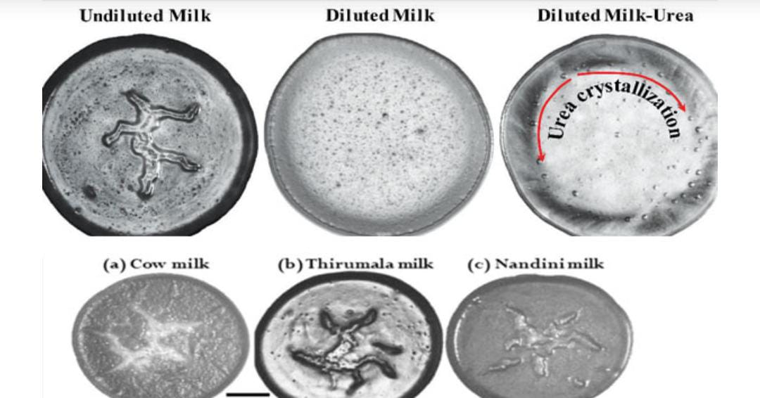 ಸೂಚಿತ ಪ್ರಮಾಣದ ಹಾಲನ್ನು ನಿರ್ದಿಷ್ಟ ಸ್ಥಿತಿಯಲ್ಲಿ ಆವಿಗೊಳಿಸುವ ಸರಳ ವಿಧಾನ ಇದಾಗಿದೆ. ಹಾಲು ಆವಿಯಾದ ನಂತರ ತಳಭಾಗದಲ್ಲಿ ಉಳಿದುಕೊಳ್ಳುವ ಗುರುತು ಹಾಗೂ ವಿನ್ಯಾಸಗಳನ್ನು ಅಧ್ಯಯನ ನಡೆಸಿ ಅದರ ಆಧಾರದಲ್ಲಿ ಕಲಬೆರಕೆ ಆಗಿದೆಯೇ ಇಲ್ಲವೇ ಎಂಬುದನ್ನು ತಿಳಿಯಬಹುದು. ಯಾವುದೇ ಕಲಬೆರಕೆ ಇಲ್ಲದ ಶುದ್ಧ ಹಾಲನ್ನು ಆವಿಯಾಗುವಂತೆ ಮಾಡಿದಾಗ ಕೊನೆಗೆ, ಮಧ್ಯಭಾಗದಲ್ಲಿ ಅಮೀಬಾ ರೀತಿಯಲ್ಲಿ ಆಕಾರವೊಂದು ಕಾಣಿಸಿಕೊಳ್ಳುತ್ತದೆ. ಇದಕ್ಕಾಗಿ ಸ್ಥಳೀಯವಾಗಿ ಪಡೆದ ಹಾಲು, ತಿರುಮಲ ಹಾಲು ಹಾಗೂ ನಂದಿನ ಹಾಲಿನ ಮಾದರಿ ಪಡೆಯಲಾಗಿದೆ. ಮೂರೂ ಮಾದರಿಯಲ್ಲಿ ಅಮೀಬಾ ರೀತಿಯ ಆಕೃತಿ ಕಂಡುಬಂದಿದೆ. ಅದೇ ರೀತಿಯಲ್ಲಿ ನೀರು ಹಾಗೂ ಯೂರಿಯಾ ಸೇರಿಸಿದ ಮಾದರಿಗಳನ್ನು ಆವಿಗೊಳಿಸಲಾಗಿದೆ. ನೀರನ್ನು ಸೇರಿಸಿದ ಹಾಲಿನಲ್ಲಿ ಈ ಆಕಾರ ಸಂಪೂರ್ಣ ಮರೆಯಾಗಿದೆ. ಯೂರಿಯಾ ಬೆರೆಸಿದ ಹಾಲಿನಲ್ಲೂ ಆಕೃತಿ ಕಣ್ಮರೆಯಾಗಿದೆ. ಯೂರಿಯಾ ಕಣಗಳು ಆವಿಯಾಗುವ ಬದಲಿಗೆ ನಡುವೆ, ಸುತ್ತಲೂ ಹರಳಿನ ರೂಪದಲ್ಲಿ ಶೇಖರಣೆಯಾಗಿವೆ.