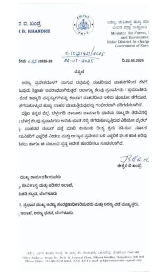 ಬೆಳ್ತಂಗಡಿ ತಾಲೂಕಿನ ಚಾರ್ಮಾಡಿ ಘಾಟ್ 4 ನೇ ತಿರುವಿನಲ್ಲಿ ಮೇ.22 ರಂದು ಬೆಳಗ್ಗೆ ರಸ್ತೆಗೆ ಬಂದಿದ್ದ ಕಾಡನೆ ಜೊತೆ ವಾಹನ ಸವಾರರು ಇಳಿದು ಸೆಲ್ಸಿ ಫೋಟೋ ತೆಗೆಯುತ್ತಿದ್ದ ಬಗ್ಗೆ ವಿಡಿಯೋ ಮಾಧ್ಯಮಗಳಲ್ಲಿ ವೈರಲ್ ಆದ ಬೆನ್ನಲ್ಲೇ ಎಚ್ಚೆತ್ತ ಅರಣ್ಯ ಸಚಿವ ಈಶ್ವರ ಬಿ ಖಂಡ್ರೆ ವಾಹನ ನಂಬರ್ ಪತ್ತೆ ಮಾಡಿ ಕಾನೂನು ಕ್ರಮ ಜರುಗಿಸಿ ಸಾರ್ವಜನಿಕರಿಗೆ ಎಚ್ಚರಿಕೆ ನೀಡಲು ಮತ್ತು ಅರಣ್ಯದ ಪ್ರವೇಶದ ಬಳಿ ಎಚ್ಚರಿಕೆ ಫಲಕ ಹಾಕಿ ಅರಿವು ಮೂಡಿಸಲು ಸಂಬಂಧ ಪಟ್ಟವರಿಗೆ ಸ್ಪಷ್ಟ ಆದೇಶ ಹೊರಡಿಸಲು ಅರಣ್ಯ ಇಲಾಖೆಯ ಪ್ರಧಾನ ಮುಖ್ಯ ಅರಣ್ಯ ಸಂರಕ್ಷಣಾಧಿಕಾರಿ ಮತ್ತು ಅರಣ್ಯ ಪಡೆ ಮುಖ್ಯಸ್ಥರಿಗೆ ಸೂಚನಾ ಪತ್ರ ಮೇ.22 ರಂದು ಸಂಜೆ ಹೊರಡಿಸಿದ್ದಾರೆ.