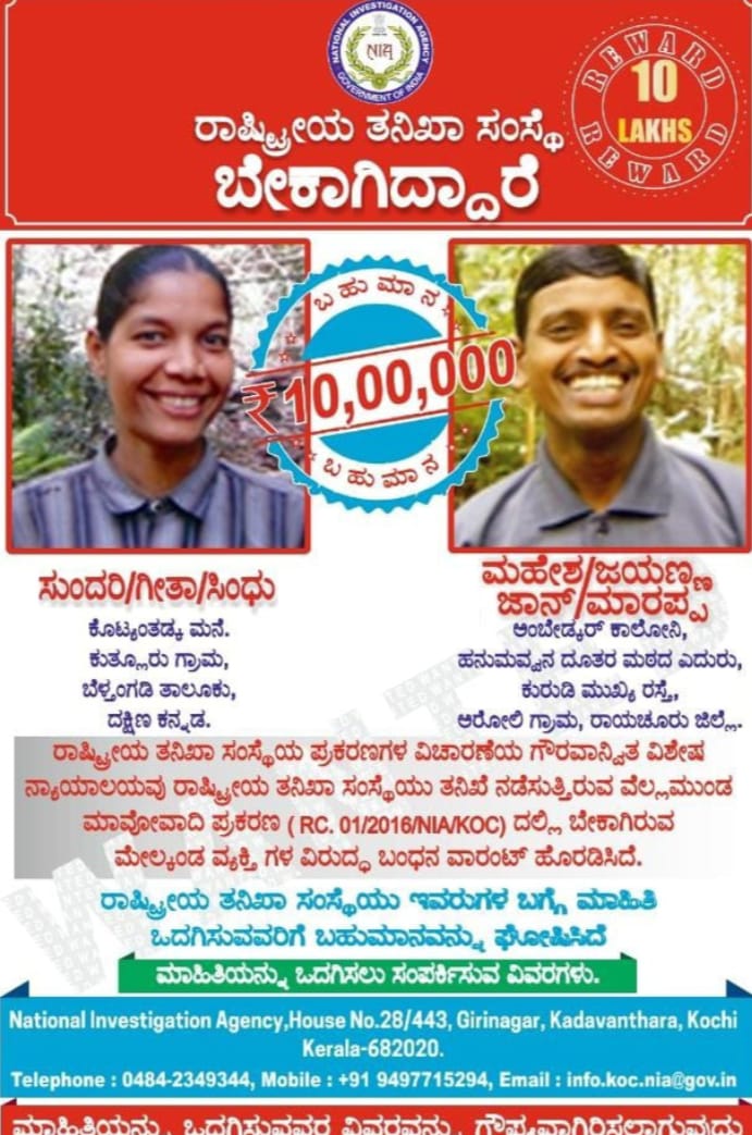 ಮಂಗಳೂರು : ಕೇರಳದ ವೆಲ್ಲಮುಂಡ ನಕ್ಸಲ್ ಪ್ರಕರಣಕ್ಕೆ ಸಂಬಂಧಿಸಿ ತಲೆಮರೆಸಿಕೊಂಡಿರುವ ರಾಜ್ಯದ ಇಬ್ಬರು ನಕ್ಸಲರ ಪತ್ತೆಗೆ ರಾಷ್ಟ್ರೀಯ ತನಿಖಾ ಸಂಸ್ಥೆ(ಎನ್ಐಎ) ತಲಾ 10 ಲಕ್ಷ ರೂಪಾಯಿ ಬಹುಮಾನ ಘೋಷಿಸಿದೆ.