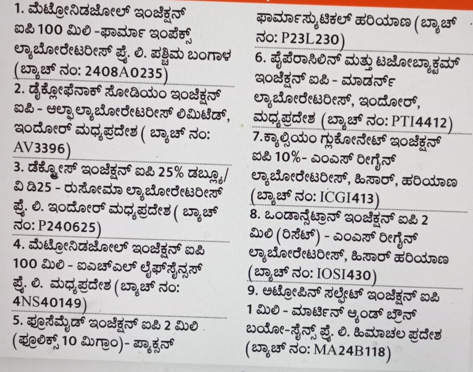 ಕಳಪೆ ಗುಣಮಟ್ಟದ 9 ಇಂಜೆಕ್ಷನ್ಗಳ ಪೈಕಿ ಎರಡು ಬ್ಯಾಚ್ನ ಇಂಜೆಕ್ಷನ್ಗಳು ಆಂಟಿಬಯೋಟಿಕ್ ಆಗಿದ್ದು, ವಾಂತಿ, ಭೇದಿ ಸಂದರ್ಭದಲ್ಲಿ ನೀಡಲಾಗುತ್ತದೆ. ಇದಲ್ಲದೆ ನೋವು ನಿವಾರಕವಾಗಿ ಬಳಲಿಕೆ, ನಿಶ್ಯಕ್ತಿಗೆ , ಕಿಡ್ನಿ ಸಮಸ್ಯೆ ಹೊಂದಿರುವವರಿಗೆ , ಹಾವು ಕಡಿತ, ವಿಷ ಸೇವನೆ ಸಂದರ್ಭದಲ್ಲಿ ಹಾಗೂ ಕ್ಯಾಲ್ಸಿಯಂ ಕೊರತೆ ಇಂಜೆಕ್ಷನ್ ಕೂಡಾ ಇದರಲ್ಲಿದೆ.