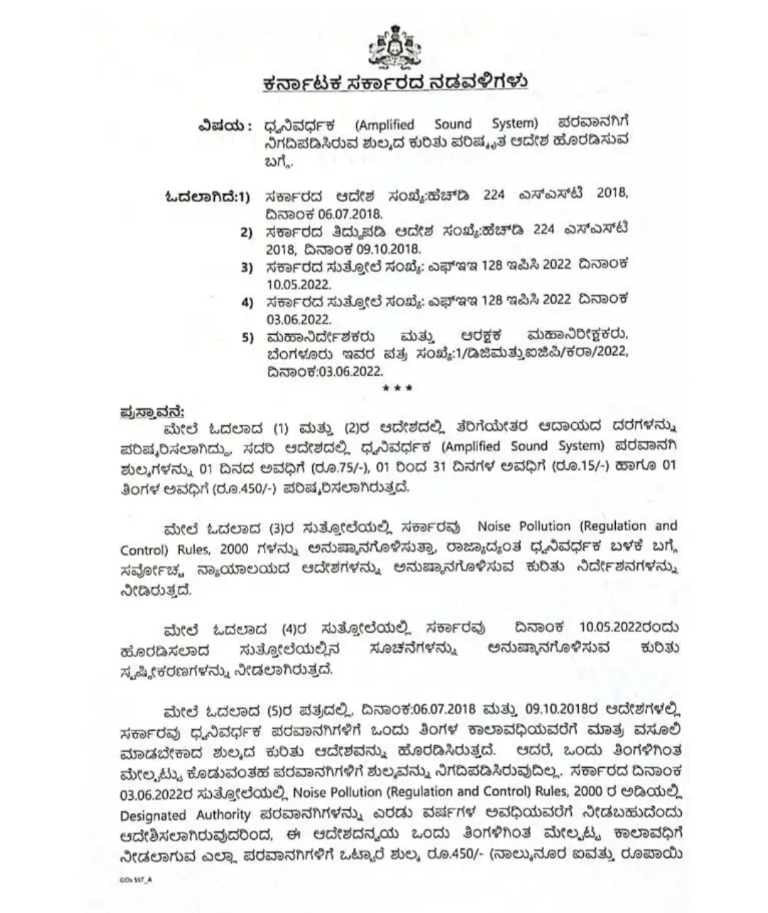 ರಾಜ್ಯ ಸರ್ಕಾರ ಹೊರಡಿಸಿರುವ ಸುತ್ತೋಲೆಯಲ್ಲಿ, Noise P0llution Rules, 200 ರ ಅಡಿಯಲ್ಲಿ ಡಿಸೈನೇಟೆಡ್ ಆತೊರಿಟಿ ಪರವಾನಗಿಗಳನ್ನು ಎರಡು ವರ್ಷಗಳ ಅವಧಿಯವರೆಗೆ ನೀಡಬಹುದೆಂದು ಆದೇಶಿಸಲಾಗಿರುವುದರಿಂದ ಈ ಆದೇಶದನ್ವಯ ಒಂದು ತಿಂಗಳಿಗಿಂತ ಮೇಲ್ಪಟ್ಟ ಕಾಲಾವಧಿಗೆ ನೀಡಲಾಗಿರುವ ಎಲ್ಲಾ ಪರವಾನಗಿಗಳಿಗೆ ಒಟ್ಟಾರೆ ಶುಲ್ಕ 450 ರೂ. ಮಾತ್ರ ನಿಗದಿಪಡಿಸಲಾಗಿರುತ್ತದೆ ಎಂದು ಹೇಳಿದೆ.