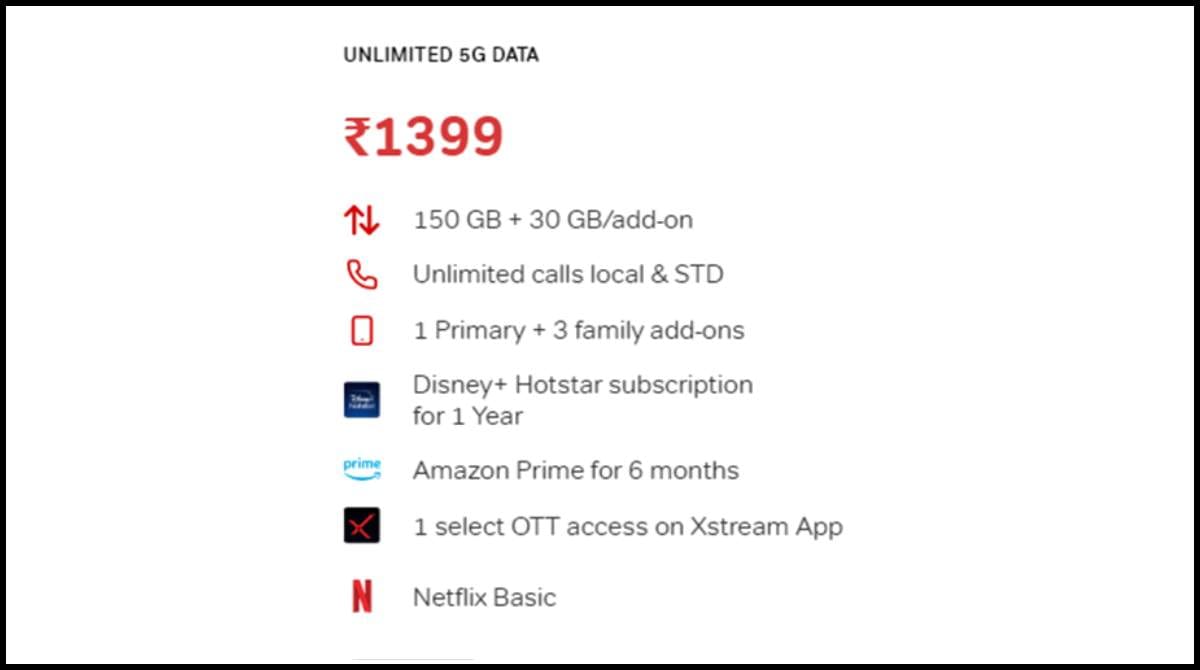 1,399 ರೂಪಾಯಿಯ ಪೋಸ್ಟ್ ಪೇಯ್ಡ್ ರೀಚಾರ್ಜ್ ಪ್ಲಾನ್ನಲ್ಲಿಯೂ ಮೂವರ ಜೊತೆ ಆಫರ್ಗಳನ್ನು ಶೇರ್ ಮಾಡಿಕೊಳ್ಳಬಹುದಾಗಿದೆ. ಅನ್ಲಿಮಿಟೆಡ್ ಕಾಲ್, ಪ್ರತಿದಿನ 150 ಎಸ್ಎಂಎಸ್, 30 ಜಿಬಿಯ ಡೇಟಾ ಸಿಗಲಿದೆ. ಜೊತೆಗೆ ಏರ್ಟೈಲ್ ಎಕ್ಸ್ಟ್ರೀಮ್, ಪ್ಲೇ ವಿಂಕ್ ಪ್ರೀಮಿಯಂ, ಆರು ತಿಂಗಳ ಅವಧಿಗೆ ಅಮೆಜಾನ್ ಪ್ರೈಮ್ ಮತ್ತು ಒಂದು ವರ್ಷಕ್ಕೆ ಡಿಸ್ನಿ ಪ್ಲಸ್ ಹಾಟ್ಸ್ಟಾರ್ ಮತ್ತು ಬೇಸಿಕ್ ನೆಟ್ಫ್ಲಿಕ್ಸ್ ಆಫರ್ ನೀಡಲಾಗುತ್ತದೆ.