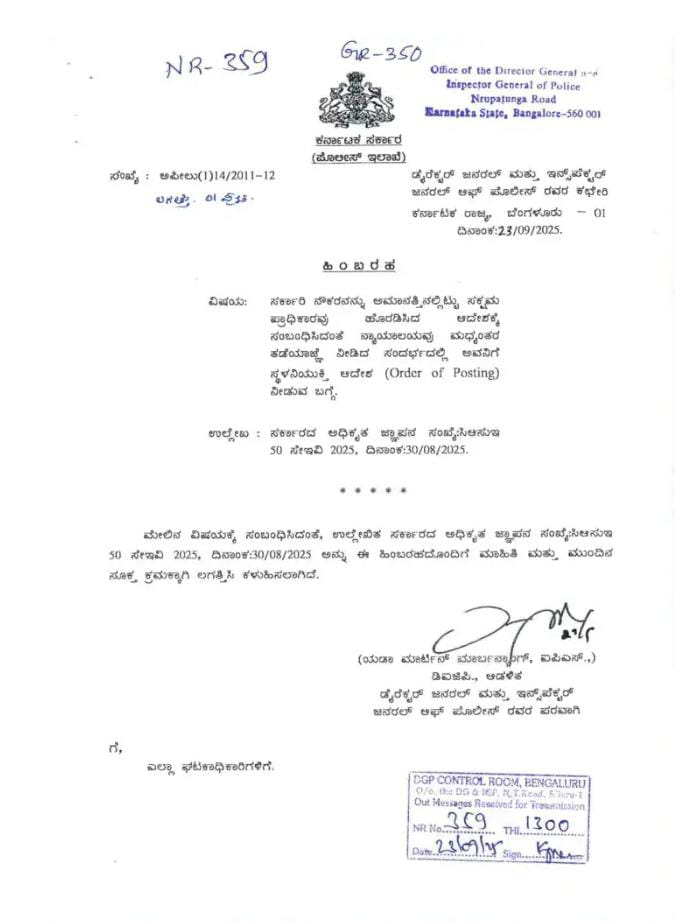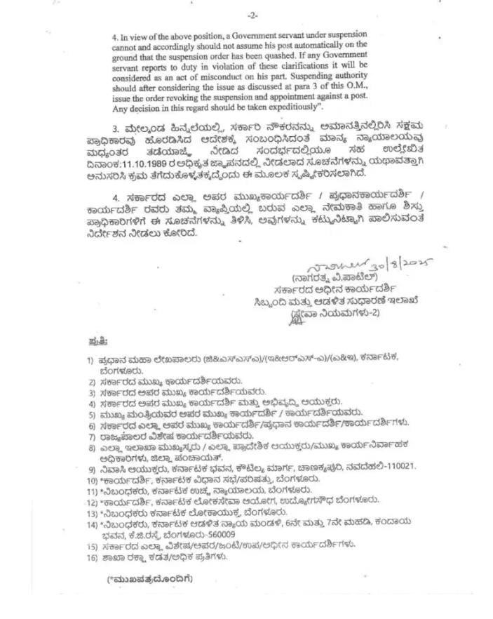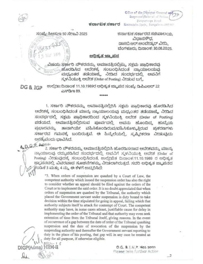 ಮೇಲಿನ ವಿಷಯಕ್ಕೆ ಸಂಬಂಧಿಸಿದಂತೆ, ಸರ್ಕಾರದ ಅಧಿಕೃತ ಜ್ಞಾಪನ ಸಂಖ್ಯೆ:ಸಿಆಸುಇ 50 ಸೇಇವಿ 2025, ದಿನಾಂಕ:30/08/2025 ಅನ್ನು ಈ ಹಿಂಬರಹದೊಂದಿಗೆ ಮಾಹಿತಿ(information) ಮತ್ತು ಮುಂದಿನ ಸೂಕ್ತ ಕ್ರಮಕ್ಕಾಗಿ ಲಗತ್ತಿಸಿ ಕಳುಹಿಸಲಾಗಿದೆ.ಸರ್ಕಾರಿ ನೌಕರನನ್ನು ಅಮಾನತ್ತಿನಲ್ಲಿಟ್ಟು ಸಕ್ಷಮ ಪ್ರಾಧಿಕಾರವು ಹೊರಡಿಸಿದ ಆದೇಶಕ್ಕೆ ಸಂಬಂಧಿಸಿದಂತೆ ನ್ಯಾಯಾಲಯವು (court) ಮಧ್ಯಂತರ ತಡೆಯಾಜ್ಞೆ ನೀಡಿದ ಸಂದರ್ಭದಲ್ಲಿ ಅವನಿಗೆ ಸ್ಥಳನಿಯುಕ್ತಿ ಬಗ್ಗೆ ಆದೇಶ ಹೊರಡಿಸಲಾಗಿದೆ.