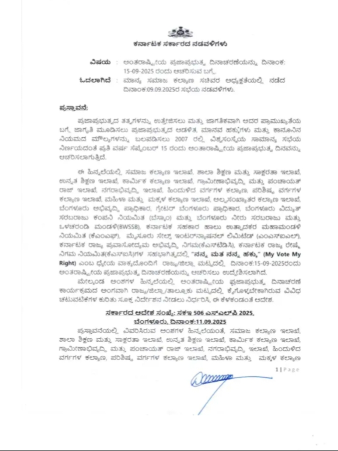 ಈ ಹಿನ್ನಲೆಯಲ್ಲಿ ಸಮಾಜ ಕಲ್ಯಾಣ ಇಲಾಖೆ, ಶಾಲಾ ಶಿಕ್ಷಣ ಮತ್ತು ಸಾಕ್ಷರತಾ ಇಲಾಖೆ, ಉನ್ನತ ಶಿಕ್ಷಣ ಇಲಾಖೆ, ಕಾರ್ಮಿಕ ಕಲ್ಯಾಣ ಇಲಾಖೆ, ಗ್ರಾಮೀಣಾಭಿವೃದ್ಧಿ ಮತ್ತು ಪಂಚಾಯತ್ ರಾಜ್ ಇಲಾಖೆ, ನಗರಾಭಿವೃದ್ಧಿ ಇಲಾಖೆ, ಹಿಂದುಳಿದ ವರ್ಗಗಳ ಕಲ್ಯಾಣ, ಪರಿಶಿಷ್ಟ ವರ್ಗಗಳ ಕಲ್ಯಾಣ ಇಲಾಖೆ, ಮಹಿಳಾ ಮತ್ತು ಮಕ್ಕಳ ಕಲ್ಯಾಣ ಇಲಾಖೆ, ಅಲ್ಪಸಂಖ್ಯಾತರ ಕಲ್ಯಾಣ ಇಲಾಖೆ, ಬೆಂಗಳೂರು ಅಭಿವೃದ್ಧಿ ಪ್ರಾಧಿಕಾರ, ಗ್ರೇಟರ್ ಬೆಂಗಳೂರು ಪ್ರಾಧಿಕಾರ, ಬೆಂಗಳೂರು ವಿದ್ಯುತ್ ಸರಬರಾಜು ಕಂಪನಿ ನಿಯಮಿತ (ಬೆಸ್ಕಾಂ) ಮತ್ತು ಬೆಂಗಳೂರು ನೀರು ಸರಬರಾಜು ಮತ್ತು ಒಳಚರಂಡಿ ಮಂಡಳಿ(BWSSB), ಕರ್ನಾಟಕ ಸಹಕಾರ ಹಾಲು ಉತ್ಪಾದಕರ ಮಹಾಮಂಡಳಿ ನಿಯಮಿತ (ಕೆಎಂಎಫ್), ಮೈಸೂರು ಸೇಲ್ಸ್ ಇಂಟರ್‌ನ್ಯಾಷನಲ್ ಲಿಮಿಟೆಡ್ (ಎಂಎಸ್‌ಐಎಲ್), ಕರ್ನಾಟಕ ರಾಜ್ಯ ಪ್ರವಾಸೋದ್ಯಮ ಅಭಿವೃದ್ಧಿ ನಿಗಮ(ಕೆಎಸ್‌ಟಿಡಿಸಿ), ಕರ್ನಾಟಕ ರಾಜ್ಯ ರೇಷ್ಮೆ ನಿಗಮ ನಿಯಮಿತ(ಕೆಎಸ್‌ಐಸಿ)ಗಳ ಸಹಭಾಗಿತ್ವದಲ್ಲಿ “ನನ್ನ ಮತ ನನ್ನ ಹಕ್ಕು” (My Vote My Right) ಎಂಬ ಧೇಯ ವಾಕ್ಯದೊಂದಿಗೆ ರಾಜ್ಯ/ಜಿಲ್ಲಾ ಮಟ್ಟದಲ್ಲಿ ದಿನಾಂಕ:15-09-2025ರಂದು ಅಂತರಾಷ್ಟ್ರೀಯ ಪ್ರಜಾಪ್ರಭುತ್ವ ದಿನಾಚರಣೆಯನ್ನು ಆಚರಿಸಲು ಉದ್ದೇಶಿಸಲಾಗಿದೆ.