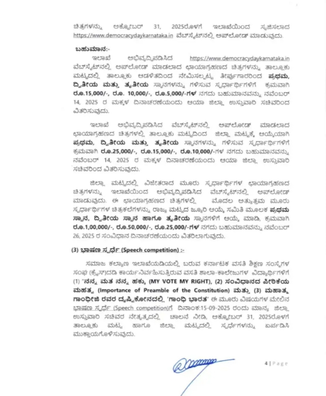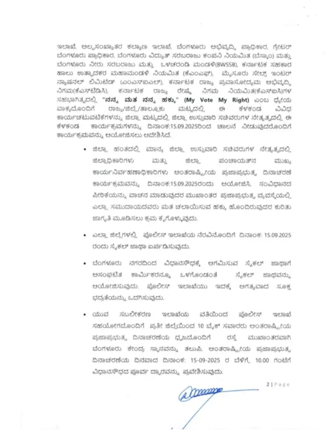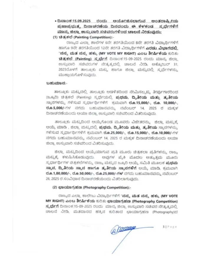 ಈ ಹಿನ್ನಲೆಯಲ್ಲಿ ಸಮಾಜ ಕಲ್ಯಾಣ ಇಲಾಖೆ, ಶಾಲಾ ಶಿಕ್ಷಣ ಮತ್ತು ಸಾಕ್ಷರತಾ ಇಲಾಖೆ, ಉನ್ನತ ಶಿಕ್ಷಣ ಇಲಾಖೆ, ಕಾರ್ಮಿಕ ಕಲ್ಯಾಣ ಇಲಾಖೆ, ಗ್ರಾಮೀಣಾಭಿವೃದ್ಧಿ ಮತ್ತು ಪಂಚಾಯತ್ ರಾಜ್ ಇಲಾಖೆ, ನಗರಾಭಿವೃದ್ಧಿ ಇಲಾಖೆ, ಹಿಂದುಳಿದ ವರ್ಗಗಳ ಕಲ್ಯಾಣ, ಪರಿಶಿಷ್ಟ ವರ್ಗಗಳ ಕಲ್ಯಾಣ ಇಲಾಖೆ, ಮಹಿಳಾ ಮತ್ತು ಮಕ್ಕಳ ಕಲ್ಯಾಣ ಇಲಾಖೆ, ಅಲ್ಪಸಂಖ್ಯಾತರ ಕಲ್ಯಾಣ ಇಲಾಖೆ, ಬೆಂಗಳೂರು ಅಭಿವೃದ್ಧಿ ಪ್ರಾಧಿಕಾರ, ಗ್ರೇಟರ್ ಬೆಂಗಳೂರು ಪ್ರಾಧಿಕಾರ, ಬೆಂಗಳೂರು ವಿದ್ಯುತ್ ಸರಬರಾಜು ಕಂಪನಿ ನಿಯಮಿತ (ಬೆಸ್ಕಾಂ) ಮತ್ತು ಬೆಂಗಳೂರು ನೀರು ಸರಬರಾಜು ಮತ್ತು ಒಳಚರಂಡಿ ಮಂಡಳಿ(BWSSB), ಕರ್ನಾಟಕ ಸಹಕಾರ ಹಾಲು ಉತ್ಪಾದಕರ ಮಹಾಮಂಡಳಿ ನಿಯಮಿತ (ಕೆಎಂಎಫ್), ಮೈಸೂರು ಸೇಲ್ಸ್ ಇಂಟರ್‌ನ್ಯಾಷನಲ್ ಲಿಮಿಟೆಡ್ (ಎಂಎಸ್‌ಐಎಲ್), ಕರ್ನಾಟಕ ರಾಜ್ಯ ಪ್ರವಾಸೋದ್ಯಮ ಅಭಿವೃದ್ಧಿ ನಿಗಮ(ಕೆಎಸ್‌ಟಿಡಿಸಿ), ಕರ್ನಾಟಕ ರಾಜ್ಯ ರೇಷ್ಮೆ ನಿಗಮ ನಿಯಮಿತ(ಕೆಎಸ್‌ಐಸಿ)ಗಳ ಸಹಭಾಗಿತ್ವದಲ್ಲಿ “ನನ್ನ ಮತ ನನ್ನ ಹಕ್ಕು” (My Vote My Right) ಎಂಬ ಧೇಯ ವಾಕ್ಯದೊಂದಿಗೆ ರಾಜ್ಯ/ಜಿಲ್ಲಾ ಮಟ್ಟದಲ್ಲಿ ದಿನಾಂಕ:15-09-2025ರಂದು ಅಂತರಾಷ್ಟ್ರೀಯ ಪ್ರಜಾಪ್ರಭುತ್ವ ದಿನಾಚರಣೆಯನ್ನು ಆಚರಿಸಲು ಉದ್ದೇಶಿಸಲಾಗಿದೆ.