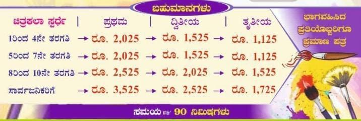 ಭಾಗವಹಿಸಿದ ಪ್ರತಿಯೊಬ್ಬರಿಗೂ ಪ್ರಮಾಣ ಪತ್ರ ಮತ್ತು ವಿಜೇತರಿಗೆ ನಗದು ಬಹುಮಾನ.