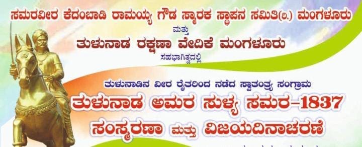 Mangaluru: ಸಮರವೀರ ಕೆದಂಬಾಡಿ ರಾಮಯ್ಯ ಗೌಡ ಸ್ಮಾರಕ ಸ್ಥಾಪನ ಸಮಿತಿ(ರಿ.) ಮಂಗಳೂರು (Mangaluru) ತುಳುನಾಡ ರಕ್ಷಣಾ ವೇದಿಕೆ ಮಂಗಳೂರು ಸಹಭಾಗಿತ್ವದಲ್ಲಿ ಮತ್ತು ತುಳುನಾಡಿನ ವೀರ ರೈತರಿಂದ ನಡೆದ ಸ್ವಾತಂತ್ರ್ಯ ಸಂಗ್ರಾಮ ತುಳುನಾಡ ಅಮರ ಸುಳ್ಯ ಸಮರ-1837 ಸಂಸ್ಮರಣಾ ಮತ್ತು ವಿಜಯ ದಿನಾಚರಣೆ ಕಾರ್ಯಕ್ರಮ ಪ್ರಯುಕ್ತ ವಿದ್ಯಾರ್ಥಿಗಳಿಗೆ ಚಿತ್ರಕಲಾ ಸ್ಪರ್ಧೆ ನಡೆಯಲಿದೆ.