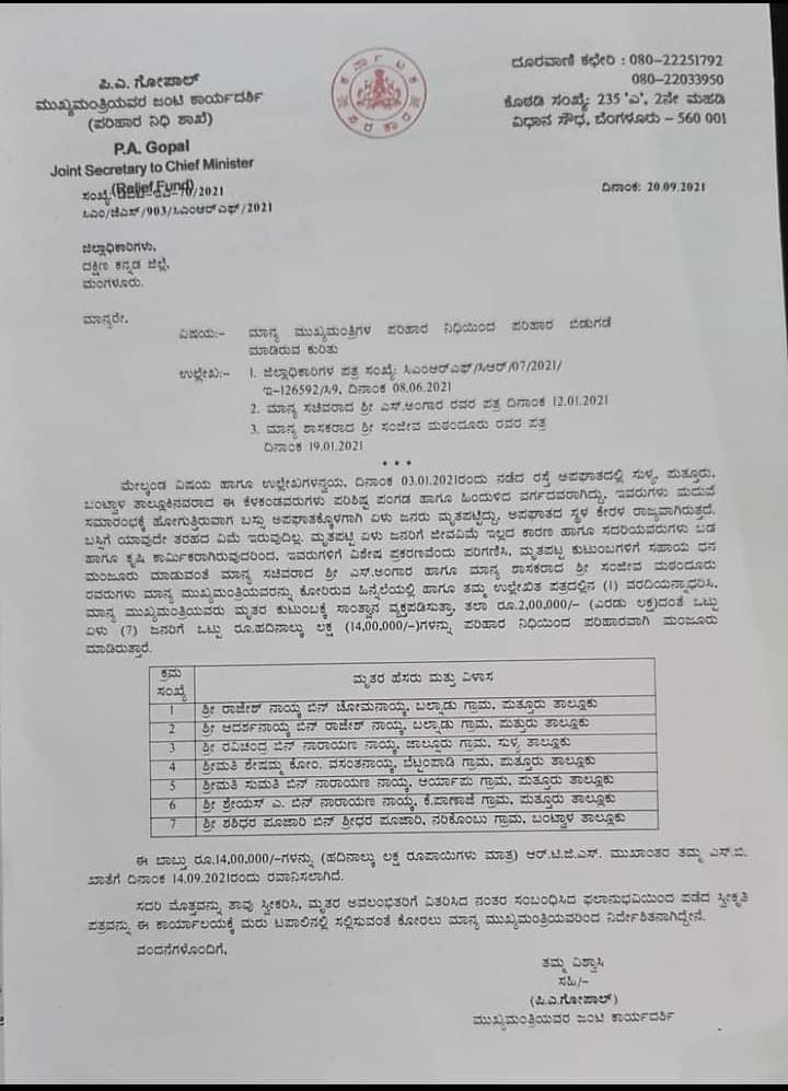 ಸುಳ್ಯ ಶಾಸಕರಾದ ,ಸಚಿವ ಎಸ್. ಅಂಗಾರ,ಪುತ್ತೂರು ಶಾಸಕ ಸಂಜೀವ ಮಠಂದೂರು ಅವರು ಸಾರಿಗೆ ಸಚಿವರಿಗೆ ಮನವಿ ಸಲ್ಲಿಸಿ ಪರಿಹಾರ ನೀಡುವಂತೆ ಮನವಿ ಮಾಡಿದ್ದರು.ಈ ಮನವಿಯಂತೆ 7 ಮಂದಿಯ ಕುಟುಂಬಗಳಿಗೆ ಪರಿಹಾರ ಮಂಜೂರಾಗಿದೆ.