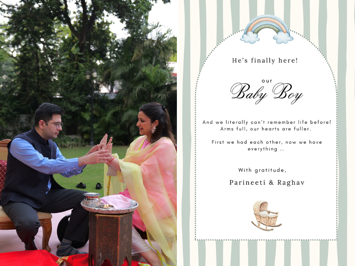ದಂಪತಿಗಳ ಇನ್ಸ್ಟಾಗ್ರಾಮ್ ಪೋಸ್ಟ್ನಲ್ಲಿ, “ಕೊನೆಗೂ ಅವನು ಇಲ್ಲಿಗೆ ಬಂದಿದ್ದಾನೆ!…ನಮ್ಮ ಗಂಡು ಮಗು…ಅಕ್ಷರಶಃ ನಮಗೆ ಹಿಂದಿನ ಬದುಕೇ ನೆನಪಾಗುತ್ತಿಲ್ಲ. ಕೈಗಳು ತುಂಬಿವೆ, ಹೃದಯಗಳು ತುಂಬಿಕೊಂಡಿವೆ. ಮೊದಲು ನಾವಿಬ್ಬರೇ ಆಗಿದ್ದೆವು, ಈಗ ನಮಗೆ ಎಲ್ಲವೂ ಇದೆ. ಕೃತಜ್ಞತೆಗಳೊಂದಿಗೆ ಪರಿಣಿತಿ ಮತ್ತು ರಾಘವ್”