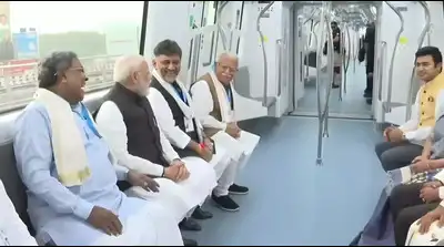 PM Modi: ಪ್ರಧಾನಿ ನರೇಂದ್ರ ಮೋದಿ ಮತ್ತು ಕರ್ನಾಟಕದ ಮುಖ್ಯಮಂತ್ರಿ ಸಿದ್ದರಾಮಯ್ಯ, ಉಪಮುಖ್ಯಮಂತ್ರಿ ಡಿಕೆ ಶಿವಕುಮಾರ್ ಸೇರಿದಂತೆ ಇತರ ನಾಯಕರೊಂದಿಗೆ ತಾವು ಉದ್ಘಾಟಿಸಿದ ಹಳದಿ ಮಾರ್ಗದಲ್ಲಿ ಬೆಂಗಳೂರು ಮೆಟ್ರೋ ರೈಲಿನಲ್ಲಿ ಒಂದು ನಗುವಿನ ಕ್ಷಣ ಹಂಚಿಕೊಂಡರು; ನಾಯಕರು ಒಟ್ಟಿಗೆ ನಗುತ್ತಿರುವುದು ಕಂಡುಬಂದಿದೆ. ನಾಯಕರು ನಗಲು ಕಾರಣವೇನು ಎಂಬುದು ಇನ್ನೂ ಸ್ಪಷ್ಟವಾಗಿಲ್ಲ.