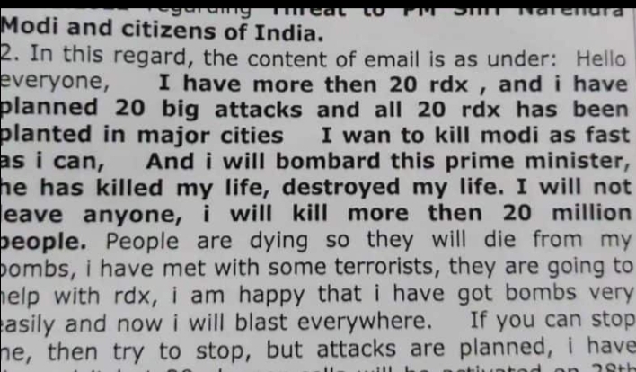 ‘ಮೋದಿಯಿಂದಾಗಿ ನನ್ನ ಜೀವನ ಹಾಳಾಗಿದೆ. ನನ್ನ ರೀತಿಯಲ್ಲೇ ಹಲವಾರು ಮಂದಿ ಸಂಕಷ್ಟದಲ್ಲಿದ್ದಾರೆ. ಮೋದಿಯನ್ನು ಮುಗಿಸುವುದೇ ನನ್ನ ಗುರಿ. 20 ಸ್ಲಿಪರ್ ಸೆಲ್ಗಳು ಸಕ್ರಿಯವಾಗಿವೆ. ಮೋದಿ ಹತ್ಯೆಗೆ 20 ಕೆಜಿ RDX ಬಳಸಲಾಗುತ್ತೆ. ದೇಶಾದ್ಯಂತ 20 ಕಡೆ RDX ಸ್ಫೋಟಿಸಿ 2 ಕೋಟಿಗೂ ಅಧಿಕ ಜನರನ್ನು ಬಲಿ ತೆಗೆದುಕೊಳ್ಳುತ್ತೇನೆ. ನಿಮ್ಮಲ್ಲಿ ತಡೆಯುವ ತಾಕತ್ತು ಇದ್ದರೆ ತಡೆಯಿರಿ’ ಎಂದು ಅನಾಮಧೇಯ ವ್ಯಕ್ತಿಯಿಂದ ಮುಂಬೈನಲ್ಲಿರುವ ನ್ಯಾಷನಲ್ ಇನ್ವೆಸ್ಟಿಗೇಶನ್ ಸಂಸ್ಥೆಗೆ ಮೇಲ್ ಬಂದಿದೆ.