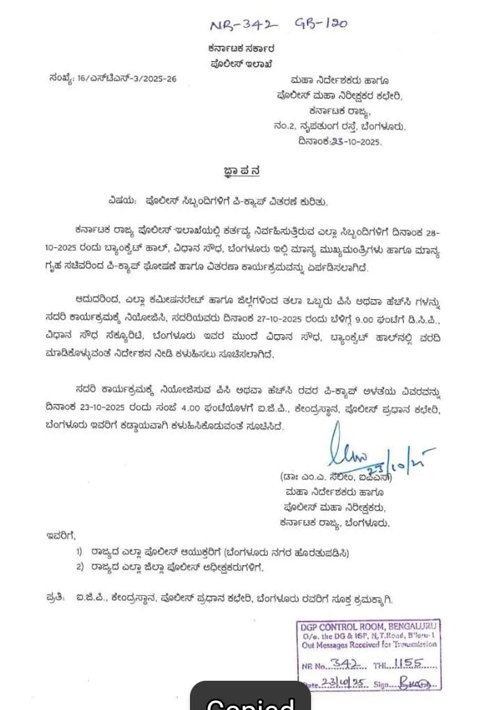 ಕರ್ನಾಟಕ ರಾಜ್ಯ ಪೊಲೀಸ್ ಇಲಾಖೆಯಲ್ಲಿ ಕರ್ತವ್ಯ ನಿರ್ವಹಿಸುತ್ತಿರುವ ಎಲ್ಲಾ ಸಿಬ್ಬಂದಿಗಳಿಗೆ ದಿನಾಂಕ 28-10-2025 ರಂದು ಬ್ಯಾಂಕ್ವೆಟ್ ಹಾಲ್, ವಿಧಾನ ಸೌಧ, ಬೆಂಗಳೂರು ಇಲ್ಲಿ ಮಾನ್ಯ ಮುಖ್ಯಮಂತ್ರಿಗಳು ಹಾಗೂ ಮಾನ್ಯ ಗೃಹ ಸಚಿವರಿಂದ ಪಿ-ಕ್ಯಾಪ್ ಘೋಷಣೆ ಹಾಗೂ ವಿತರಣಾ ಕಾರ್ಯಕ್ರಮವನ್ನು ಏರ್ಪಡಿಸಲಾಗಿದೆ.