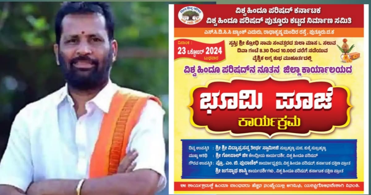 ಪುತ್ತೂರಿನ ಎಸ್ಡಿಸಿಸಿ ಬ್ಯಾಂಕ್ ಮುಂಭಾಗದಲ್ಲಿ ವಿಶ್ವ ಹಿಂದೂ ಪರಿಷದ್ ಕಾರ್ಯಾಲಯವು ಇದ್ದಿದ್ದು, ಈ ಸ್ಥಳದಲ್ಲಿ ಅ.23 ರಂದು ವಿಶ್ವ ಹಿಂದೂ ಪರಿಷತ್ನ ನೂತನ ಜಿಲ್ಲಾ ಕಾರ್ಯಾಲಯದ ಭೂಮಿ ಪೂಜೆಯನ್ನು ಕುಕ್ಕೆ ಸುಬ್ರಹ್ಮಣ್ಯದ ನರಸಿಂಹಸ್ವಾಮಿ ಸಂಪುಟ ಮಠದ ಶ್ರೀ ವಿದ್ಯಾಪ್ರಸನ್ನ ತೀರ್ಥ ಸ್ವಾಮೀಜಿಯವರ ಉಪಸ್ಥಿತಿಯಲ್ಲಿ ಕಾರ್ಯಕ್ರಮವನ್ನು ಆಯೋಜನೆ ಮಾಡಲಾಗಿತ್ತು.