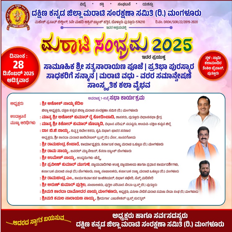 Puttur: ದಕ್ಷಿಣ ಕನ್ನಡ ಜಿಲ್ಲಾ ಮರಾಟಿ ಸಂರಕ್ಷಣಾ ಸಮಿತಿ (ರಿ.) ಮಂಗಳೂರುಇದರ ಆಶ್ರಯದಲ್ಲಿ ಮರಾಟಿ ಸಂಭ್ರಮ 2025 ಆಯೋಜಿಸಲಾಗಿದೆ.