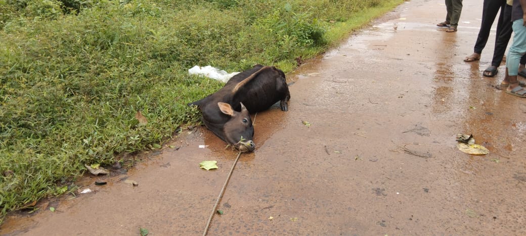 ವಿದ್ಯುತ್ ತಂತಿಯ ಮೇಲೆ ಮರಬಿದ್ದ ಪರಿಣಾಮ ರಸ್ತೆಗೆ ವಾಲಿದ ವಿದ್ಯುತ್ ತಂತಿಗೆ ಹೋರಿ ಸ್ಪರ್ಶವಾಗಿದೆ.