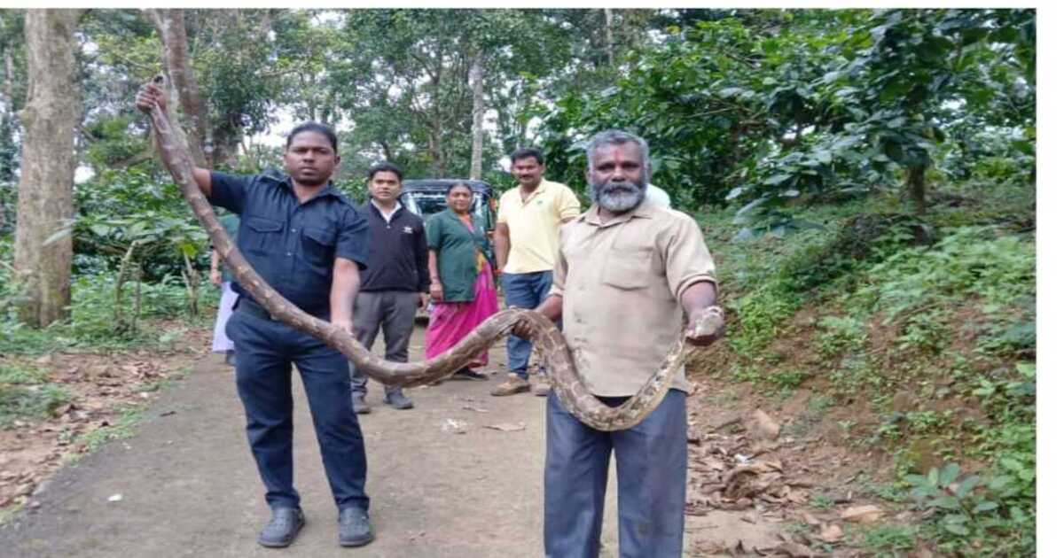 Pythons: ವಿರಾಜಪೇಟೆ. ಪೆರಂಬಾಡಿಯ ಮಂಗೋಲಿಯ ಖಾಸಗಿ ರೆಸಾರ್ಟ್ ನ(Resort) ಕಾಫಿ ತೋಟದಲ್ಲಿ( coffee estates) ಸಂಜೆಗೆ ವೇಳೆ ಬಾರಿ ಗಾತ್ರದ ಹೆಬ್ಬಾವು ಕಾಣಿಸಿಕೊಂಡಿದ್ದು ತೋಟದಲ್ಲಿ ಕೆಲಸ ಮಾಡುತ್ತಿದ್ದ ಸಿಬ್ಬಂದಿಗಳಲ್ಲಿ ಭಯ ಉಂಟುಮಾಡಿದ ಘಟನೆ ನಡೆದಿದೆ. ತಕ್ಷಣವೇ ರೆಸಾರ್ಟ್ ನ ವ್ಯವಸ್ಥಾಪಕರಿಗೆ ಸಿಬ್ಬಂದಿ ಗಳು ಮಾಹಿತಿ ನೀಡಿದ್ದಾರೆ ,