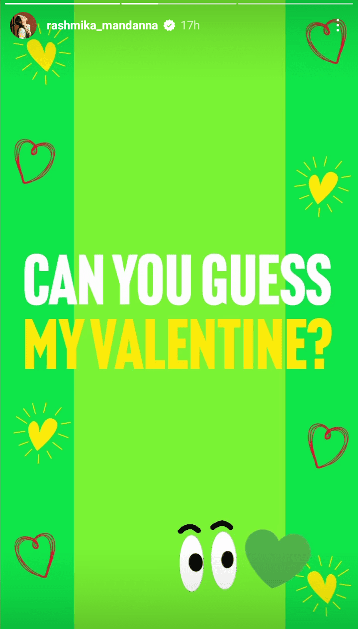 ರಶ್ಮಿಕಾ ತಮ್ಮ ಇನ್ಸ್ಟಾಗ್ರಾಮ್ ಖಾತೆಯಲ್ಲಿ ಪೋಸ್ಟ್ ಒಂದನ್ನು ಶೇರ್ ಮಾಡಿದ್ದು, ‘ನನ್ನ ವ್ಯಾಲೆಂಟೈನ್ ಯಾರು ಎಂದು ಊಹಿಸುತ್ತೀರಾ?’ ಎಂದು ಬರೆದುಕೊಂಡಿದ್ದಾರೆ. ಇದು ಅಭಿಮಾನಿಗಳಲ್ಲಿ ಸಾಕಷ್ಟು ಕುತೂಹಲ ಮೂಡಿಸಿದ್ದು, ಚರ್ಚೆಗೆ ಕಾರಣವಾಗಿದೆ. ಸದ್ಯ ಈ ಕುತೂಹಲ, ಚರ್ಚೆಗಳಿಗೆ ಫೆ.14ರಂದು ರಶ್ಮಿಕಾ ತೆರೆ ಎಳೆಯಲಿದ್ದಾರೆ. ಅಲ್ಲಿವರೆಗೂ ರಶ್ಮಿಕಾ ವ್ಯಾಲೆಂಟೈನ್ ಯಾರು ಎಂದು ತಿಳಿಯಲು ಕಾಯಬೇಕಿದೆ.