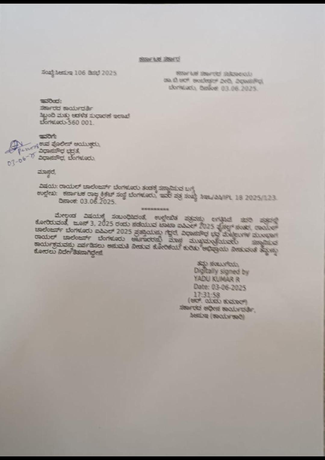 ಈ ಸಂಭ್ರಮಕ್ಕಾಗಿ ಐಪಿಎಲ್ ಫೈನಲ್ ಗೆದ್ದ ಆರ್ ಸಿಬಿ ತಂಡಕ್ಕೆ ವಿಧಾನಸೌಧದ ಮುಂದೆ ಸನ್ಮಾನ ಮಾಡಲು ಸರ್ಕಾರಕ್ಕೆ ಕೆಎಸ್ ಸಿಎಲ್ ಪತ್ರ ಬರೆದಿದೆ.