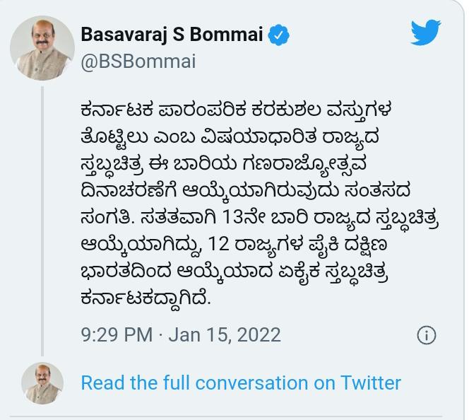 ಈ ಬಾರಿಯ ಗಣರಾಜ್ಯೋತ್ಸವಕ್ಕೆ 12 ರಾಜ್ಯಗಳ ಪೈಕಿ ಕರ್ನಾಟಕದಿಂದ ಏಕೈಕ ಸ್ತಬ್ದಚಿತ್ರವೊಂದು ಆಯ್ಕೆಯಾಗಿದ್ದು, ರಾಜ್ಯದ ಮುಖ್ಯಮಂತ್ರಿ ಬೊಮ್ಮಾಯಿ ಸಂತಸ ವ್ಯಕ್ತಪಡಿಸಿದ್ದಾರೆ.