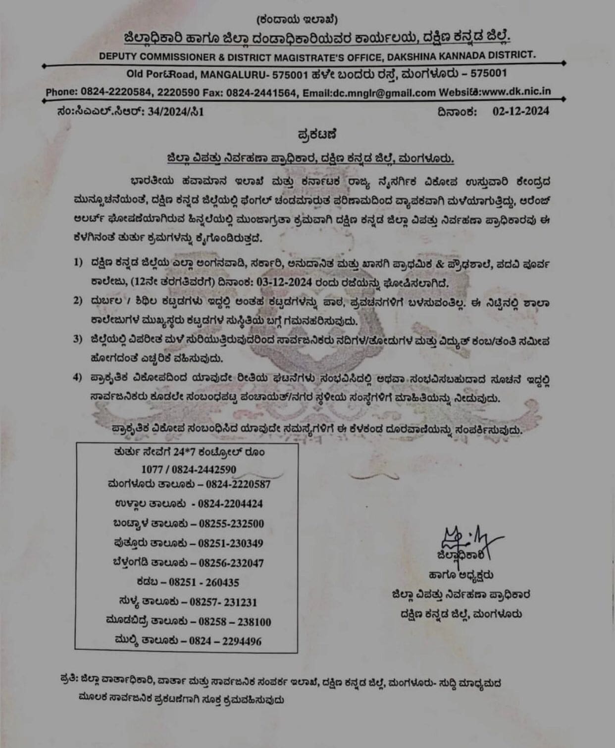 Dakshina Kannada: ಫೆಂಗಲ್ ಚಂಡಮಾರುತದ ಹಿನ್ನೆಲೆ ದಕ್ಷಿಣ ಕನ್ನಡ ಜಿಲ್ಲೆಯ ಎಲ್ಲಾ ಅಂಗನವಾಡಿ, ಸರಕಾರಿ, ಅನುದಾನಿತ ಮತ್ತು ಖಾಸಗಿ ಪ್ರಾಥಮಿಕ ಮತ್ತು ಪ್ರೌಢಶಾಲೆ, ಪದವಿ ಪೂರ್ವ ಕಾಲೇಜುಗಳಿಗೆ ದಿನಾಂಕ 03-12-2024 ರಂದು ರಜೆ ಘೋಷಣೆ ಮಾಡಲಾಗಿದೆ.