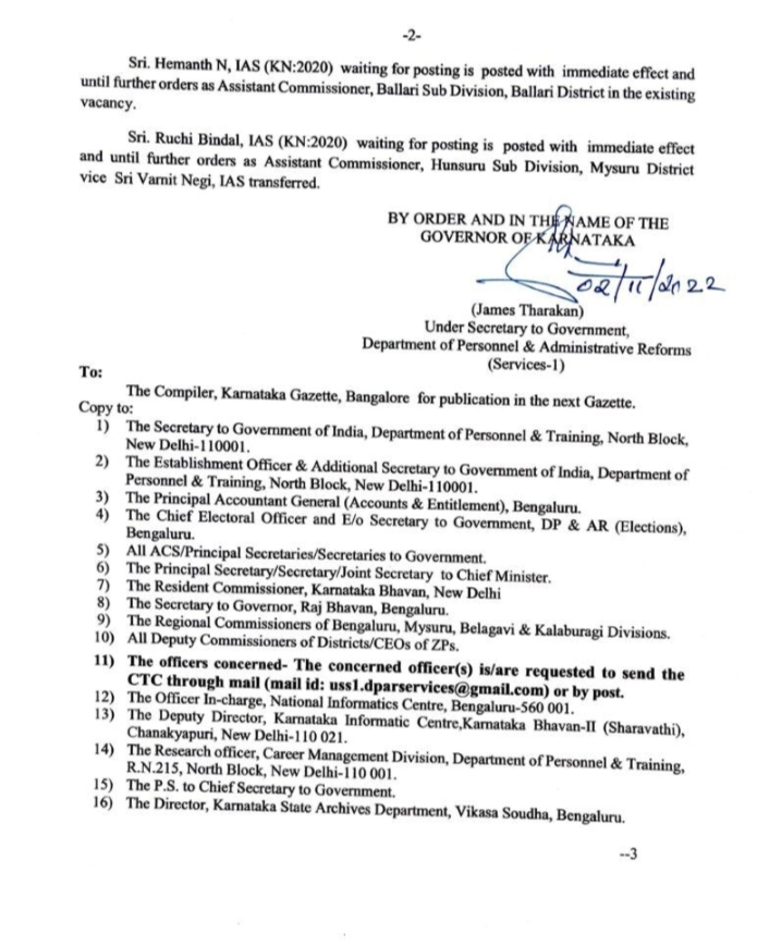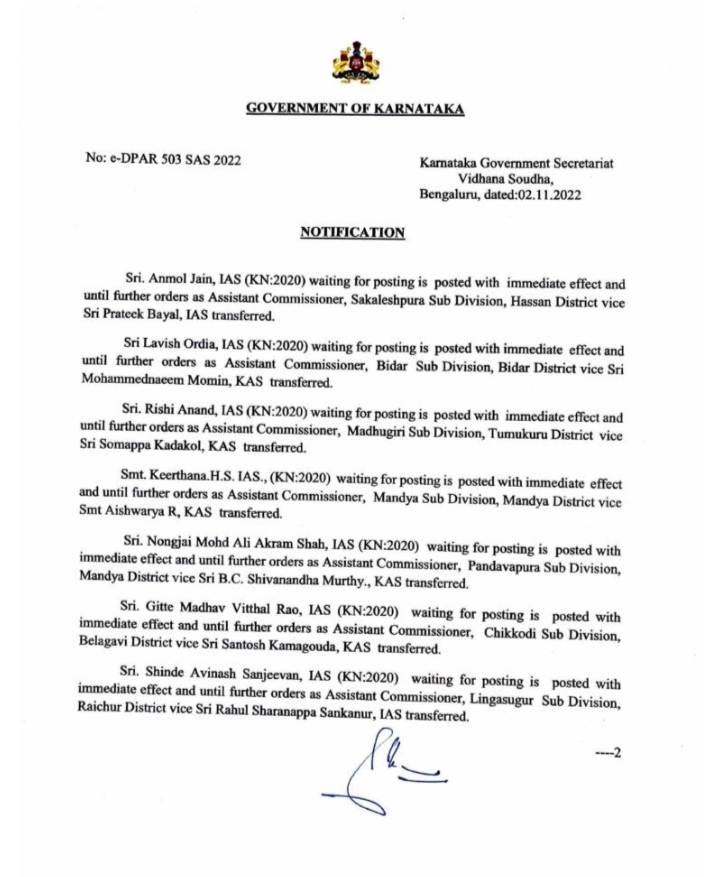 2020ನೇ ಬ್ಯಾಚ್ ನ ಕರ್ನಾಟಕ ಕೇಡರ್ ಐಎಎಸ್ ಅಧಿಕಾರಿ ಲವಿಶ್ ಒರ್ಡಿಯಾ ಅವರನ್ನು ಬೀದರ್ ಉಪ ವಿಭಾಗದ ಎಸಿಯನ್ನಾಗಿ, ರಿಷಿ ಆನಂದ್ ಅವರನ್ನು ಮಧುಗಿರಿ ಉಪವಿಭಾಗದ ಎಸಿಯನ್ನಾಗಿ, ಮಂಡ್ಯ ಉಪ ವಿಭಾಗದ ಎಸಿಯನ್ನಾಗಿ ಕೀರ್ತನಾ ಹೆಚ್ ಎಸ್ ಅವರನ್ನು ನಿಯೋಜಿಸಿದೆ.