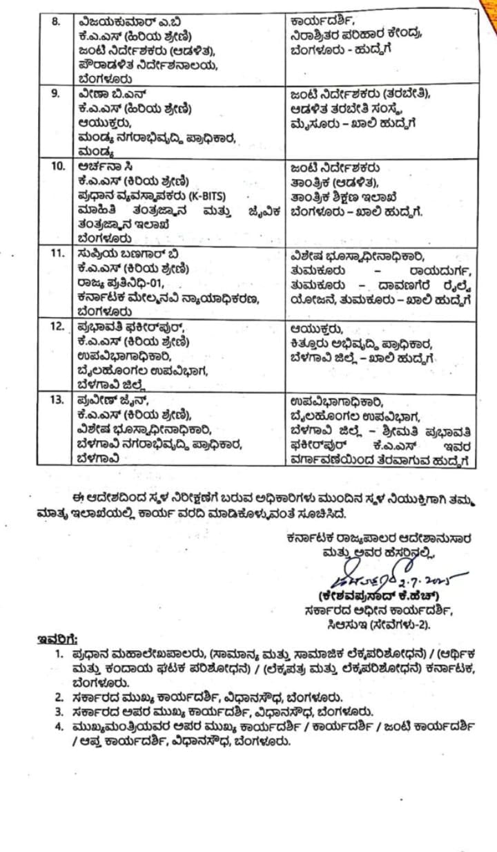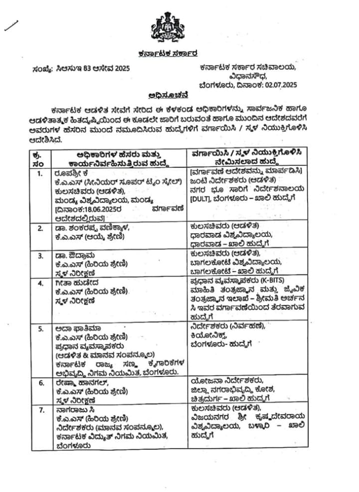 KAS Officers Trasfer: ಕೆಎಎಸ್ ಅಧಿಕಾರಿಗಳ ವರ್ಗಾವಣೆಯನ್ನು ರಾಜ್ಯ ಸರಕಾರ ಮಾಡಿದೆ. ಕರ್ನಾಟಕ ಆಡಳಿತ ಸೇವೆಗೆ ಸೇರಿದ ಈ ಕೆಳಕಂಡ ಅಧಿಕಾರಿಗಳನ್ನು ಸಾರ್ವಜನಿಕ ಹಾಗೂ ಆಡಳಿತಾತ್ಮಕ ಹಿತದೃಷ್ಟಿಯಿಂದ ಕೂಡಲೇ ಜಾರಿಗೆ ಬರುವಂತೆ ಮುಂದಿನ ಆದೇಶದವರೆಗೆ ಅವರುಗಳ ಹೆಸರಿನ ಮುಂದೆ ನಮೂದಿಸಿರುವ ಹುದ್ದೆಗಳಿಗೆ ವರ್ಗಾಯಿಸಿ/ಸ್ಥಳ ನಿಯುಕ್ತಿಗೊಳಿಸಿ ಆದೇಶವನ್ನು ಹೊರಡಿಸಲಾಗಿದೆ.