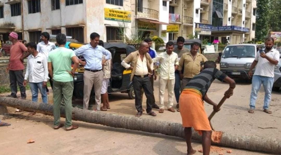 ಸುಳ್ಯ: ತೆಂಗಿನ ಮರ ರಸ್ತೆಗೆ ಅಡ್ಡವಾಗಿ ಬಿದ್ದು ರಸ್ತೆಯ ಬದಿಯಲ್ಲಿ ನಿಲ್ಲಿಸಿದ್ದ ಆಟೋರಿಕ್ಷಾ ಹಾಗೂ ಸ್ಕೂಟರಿಗೆ ಹಾನಿಯಾದ ಘಟನೆ ಸುಬ್ರಹ್ಮಣ್ಯದ ಕಾಶಿಕಟ್ಟೆ ಬಳಿ ಇಂದು ನಡೆದಿದೆ.