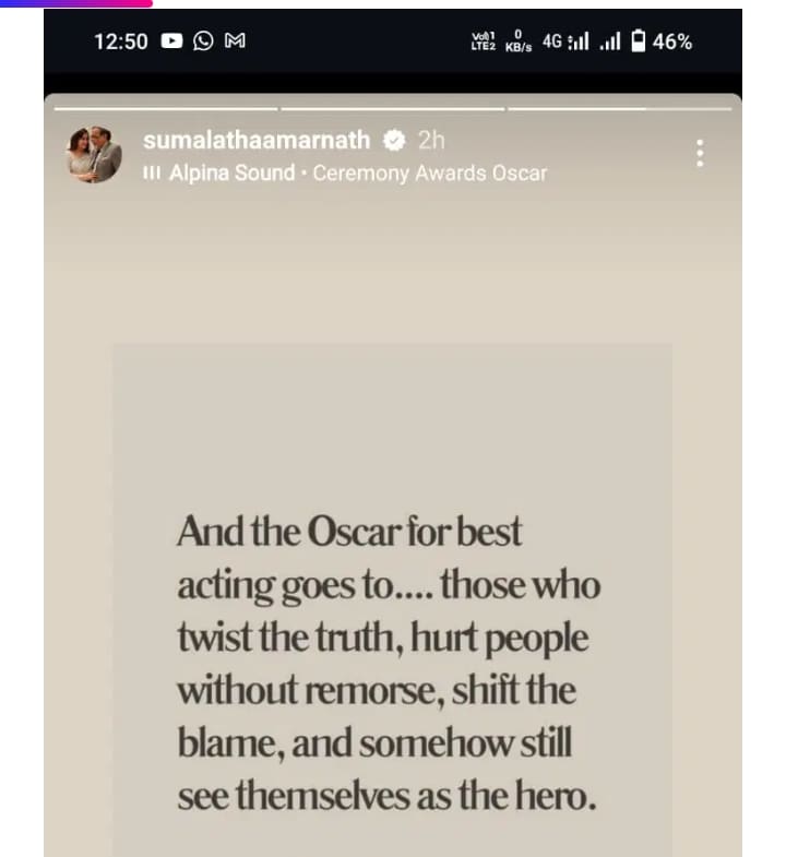 ಬೆಸ್ಟ್ ಆಕ್ಟಿಂಗ್ ಆಸ್ಕರ್ ಅವಾರ್ಡ್ ಯಾರಿಗೆ ಹೋಗುತ್ತೆ ಅಂದ್ರೆ.. ಯಾರು ಸತ್ಯವನ್ನ ತಿರುಚುತ್ತಾರೋ, ತಮ್ಮದೇ ತಪ್ಪು ಇಟ್ಕೊಂಡು ಬೇರೆಯವರ ಮೇಲೆ ಹಾಕಿ ನೋವು ಮಾಡೋದು, ತಮ್ಮ ಮೇಲಿನ ನಿಂದನೆಯನ್ನ ಬೇರೆಯವರ ಮೇಲೆ ಹಾಕೋದು, ಗೂಬೆ ಕೂರಿಸೋದು ಮಾಡಿ ತಮ್ಮನ್ನ ತಾವು ಹೀರೋ ಎಂಬಂತೆ ಬಿಂಬಿಸಿಕೊಳ್ಳೋದು ಎಂದು ಸುಮಲತಾ ಅವರು ಪೋಸ್ಟ್ ಮಾಡಿದ್ದಾರೆ.