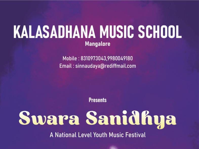 Mangalore February 8: ಮಂಗಳೂರಿನ ಕಲಾ ಸಾಧನ ಸಂಸ್ಥೆ ವತಿಯಿಂದ ನಗರದ ಟಿಎಂಎ ಪೈ ಇಂಟರ್ನ್ಯಾಶನಲ್ ಕನ್ವೆನ್ಷನ್ ಸೆಂಟರ್ ನಲ್ಲಿ ಸ್ವರ ಸಾನಿಧ್ಯ ರಾಷ್ಟ್ರೀಯ ಮಟ್ಟದ ಯುವ ಸಂಗೀತೋತ್ಸವ ಹಾಗೂ ದೇಶದ ಖ್ಯಾತ ಸಂಗೀತ ಕಲಾವಿದರ ಸಂಗೀತ ಕಾರ್ಯಕ್ರಮ ಫೆಬ್ರವರಿ 8 ರಂದು ನಡೆಯಲಿದೆ.