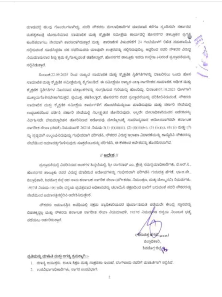 ತಹಶೀಲ್ದಾರ್. ಹೊಸನಗರ ರವರ ಪ್ರಸ್ತಾವನೆಯನ್ನು ಪರಿಶೀಲಿಸಿರುವಂತೆ, ನೌಕರರು ಸಾಮಾಜಿಕ ಮತ್ತು ಶೈಕ್ಷಣಿಕ ಸಮೀಕ್ಷೆಯ ಕಾರ್ಯಗಳಿಗೆ ತೊಂದರೆಯನ್ನುಂಟು ಮಾಡಿರುವುದು ಮತ್ತು ಸರ್ಕಾರಿ ಸೇವೆಯಲ್ಲಿ ಉದ್ದಟತನದಿಂದ ವರ್ತಿಸಿ ಸರ್ಕಾರಿ ಸೇವೆಯಲ್ಲಿ ನಿರ್ಲಕ್ಷ್ಯತನ ತೋರಿರುವ ಕಾರಣ ನೌಕರರ ವಿರುದ್ಧ ಇಲಾಖಾ ವಿಚಾರಣೆಯನ್ನು ಕಾಯ್ದಿರಿಸಿ ನೌಕರರನ್ನು ಸೇವೆಯಿಂದ ಅಮಾನತ್ತುಗೊಳಿಸುವುದು ಸೂಕ್ತವೆಂಬುದನ್ನು ಪರಿಗಣಿಸಿ. ಈ ಕೆಳಕಂಡ ಆದೇಶವನ್ನು ಹೊರಡಿಸಲಾಗಿದೆ.