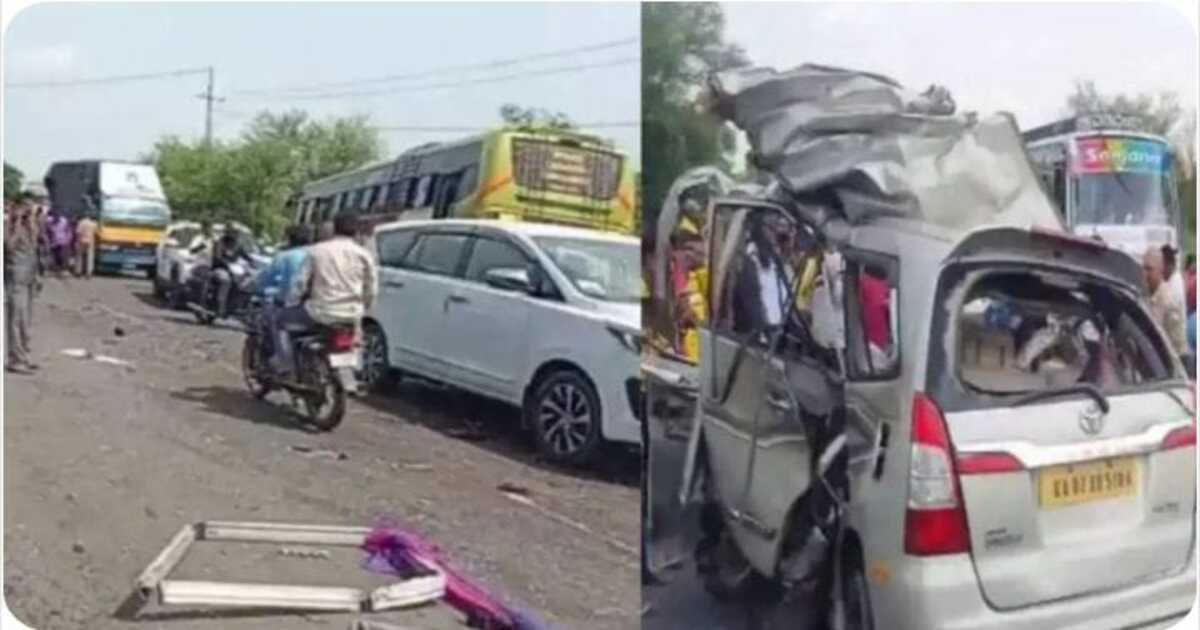 ಖಾಸಗಿ ಬಸ್ ಮತ್ತು ಕಾರ್ ನಡುವೆ ಕುರುಬೂರು ಬಳಿ ಈ ಘೋರ ದುರಂತ ಸಂಭವಿಸಿದ್ದು, ಇನ್ನೋವಾ ಕಾರಿನಲ್ಲಿ 13 ಮಂದಿ ಪ್ರಯಾಣಿಸುತ್ತಿದ್ದು, ಅದರಲ್ಲಿ 10 ಮಂದಿ ದಾರುಣವಾಗಿ ಸಾವನ್ನಪ್ಪಿದ್ದಾರೆ.