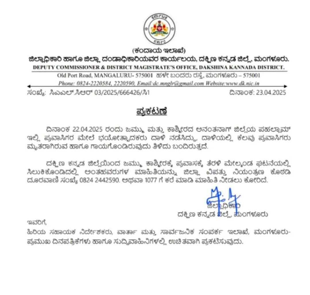 ದಕ್ಷಿಣ ಕನ್ನಡ ಜಿಲ್ಲೆಯಿಂದ ಜಮ್ಮು ಕಾಶ್ಮೀರಕ್ಕೆ ಪ್ರವಾಸಕ್ಕೆ ತೆರಳಿ ಮೇಲ್ಕಂಡ ಘಟನೆಯಲ್ಲಿ ಸಿಲುಕಿಕೊಂಡಿದಲ್ಲಿ ಅಂತಹವರುಗಳ ಮಾಹಿತಿಯನ್ನು ಜಿಲ್ಲಾ ವಿವತ್ತು ನಿಯಂತ್ರಣ ಕೊಠಡಿ ದೂರವಾಣಿ ಸಂಖ್ಯೆ 0824 2442590. ಅಥವಾ 1077 ಗೆ ಕರೆ ಮಾಡಿ ಮಾಹಿತಿ ನೀಡಲು ಕೋರಿದೆ.