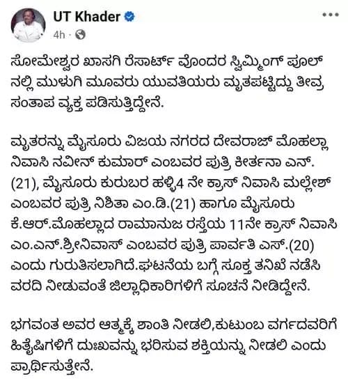 ತಮ್ಮ ಸೋಶಿಯಲ್ ಮೀಡಿಯಾದಲ್ಲಿ ಪೋಸ್ಟ್ ಒಂದನ್ನು ಹಾಕಿಕೊಂಡಿರುವ ಅವರು ‘ಸೋಮೇಶ್ವರ ಖಾಸಗಿ ರೆಸಾರ್ಟ್ ವೊಂದರ ಸ್ವಿಮ್ಮಿಂಗ್ ಪೂಲ್ ನಲ್ಲಿ ಮುಳುಗಿ ಮೂವರು ಯುವತಿಯರು ಮೃತಪಟ್ಟದ್ದಕ್ಕೆ ತೀವ್ರ ಸಂತಾಪ ವ್ಯಕ್ತಪಡಿಸುತ್ತಿದ್ದೇನೆ ಎಂದು ಸ್ಪೀಕರ್ ತಿಳಿಸಿದ್ದಾರೆ.