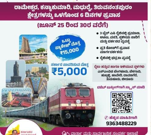 Karnataka: ಧಾರ್ಮಿಕ ದತ್ತಿ ಇಲಾಖೆಯಿಂದ ಕರ್ನಾಟಕ (Karnataka) ಭಾರತ ಗೌರವ ದಕ್ಷಿಣ ಕ್ಷೇತ್ರಗಳ ಯಾತ್ರೆಯನ್ನು ಹಮ್ಮಿಕೊಳ್ಳಲಾಗಿದೆ. ರಾಮೇಶ್ವರ, ಕನ್ಯಾಕುಮಾರಿ, ಮಧುರೈ, ತಿರುವನಂತಪುರಂ ಕ್ಷೇತ್ರಗಳನ್ನು ಒಳಗೊಂಡ 6 ದಿನಗಳ ಪ್ರವಾಸ ಇದಾಗಿದೆ.
