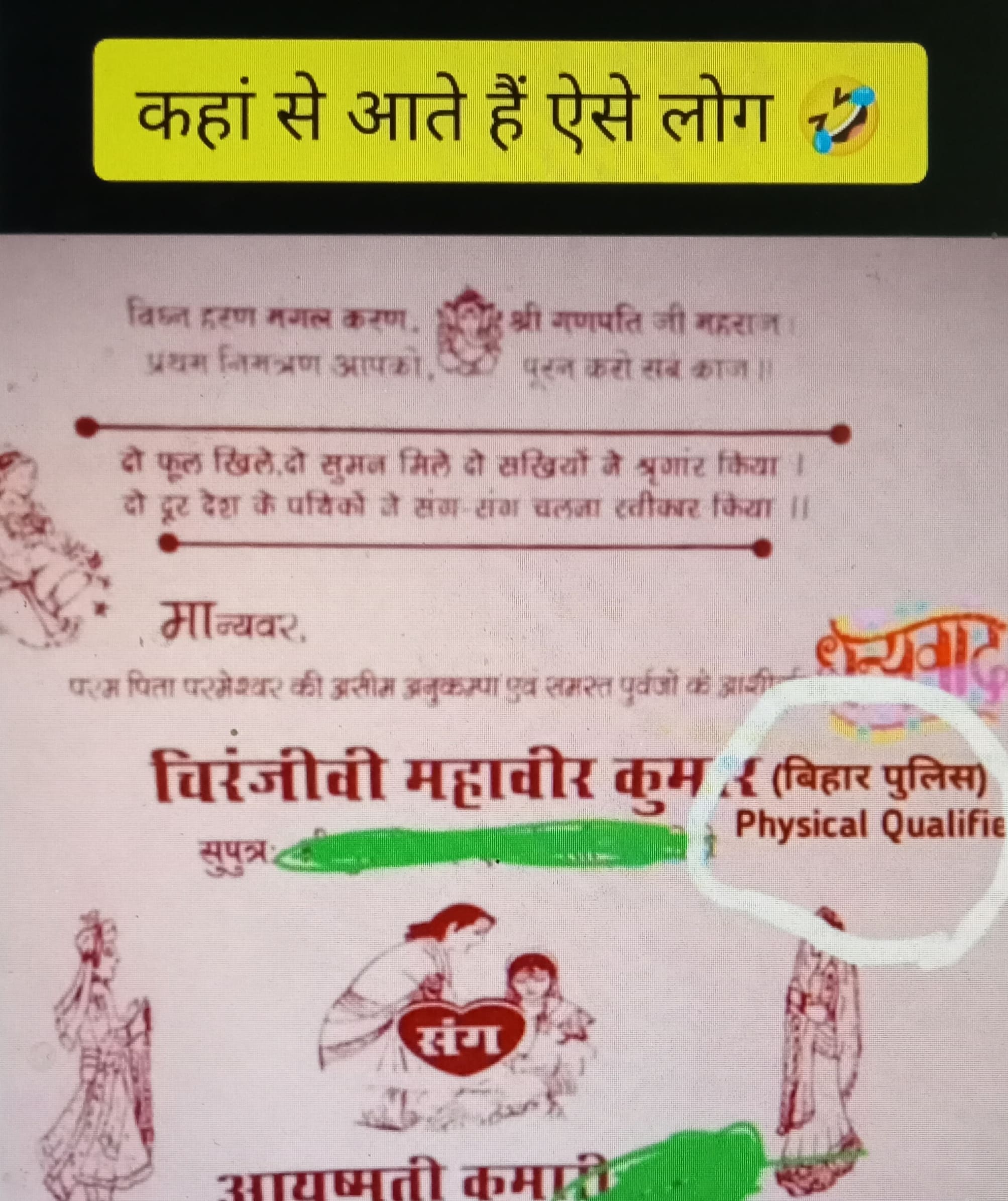 ಈ ವಿಡಿಯೋದಲ್ಲಿ ಮದುವೆ ಕಾರ್ಡಿನಲ್ಲಿ ಮಹಾವೀರ್ ಎಂದು ವರನ ಹೆಸರನ್ನು ಬರೆಯಲಾಗಿದ್ದು, ಅದರ ಕೆಳಗೆ ಫಿಸಿಕಲ್ ಕ್ವಾಲಿಫೈಡ್ ಎಂದು ಉಲ್ಲೇಖ ಮಾಡಿರುವುದು ಕಂಡು ಬಂದಿದೆ.