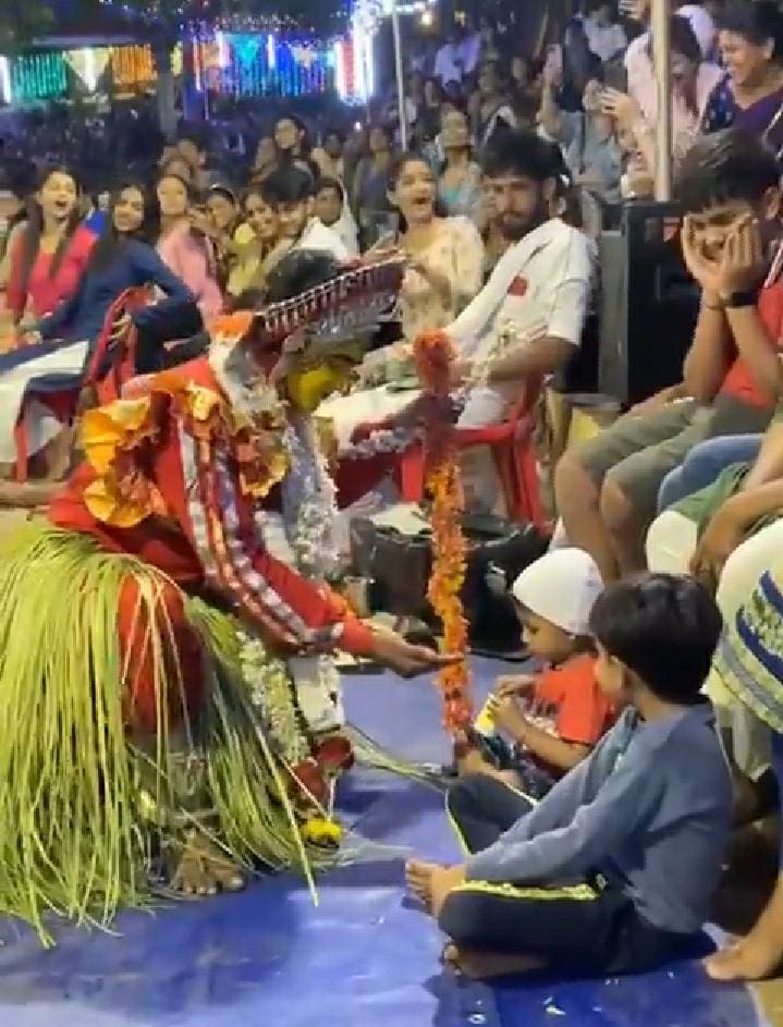 ಮಗುವೊಂದು ನೆಲದಲ್ಲಿ ಕುಳಿತ ನೇಮೋತ್ಸವನ್ನು ಸ್ವೀಟ್ ಕಾರ್ನ್ ತಿನ್ನುತ್ತಾಕಣ್ಣು ಮಿಟುಕಿಸುತ್ತ ನೋಡುತ್ತಿತ್ತು. ಈ ಮಗುವನ್ನು ಕಂಡು, ಕಾಂತೇರಿ ಜುಮಾದಿ ದೈವ ಮಗುವಿನ ಹತ್ತಿರ ಬಂದು ಆಟವಾಡಲು ತೊಡಗಿದೆ. ಮಗುವಿನ ಬಳಿ ಕೈ ಚಾಚಿ ತನಗೂ ತಿನ್ನೋದಕ್ಕೆ ಕೊಡುವಂತೆ ಕೈ ಚಾಚಿದೆ. ದೈವ ತನ್ನಲ್ಲಿಗೆ ಬಂದಾಗ ಕೊಂಚವೂ ಭಯಪಡದೇ, ಮಗು ಸ್ವೀಟ್ ಕಾರ್ನ್ ನೀಡಲು ಮುಂದಾಗಿದೆ. ಕಾಂತೇರಿ ದೈವ ಮಗುವಿನ ಜತೆ ಕೀಟಲೆ ಮಾಡುತ್ತಾ ಒಂದೆರಡು ಕ್ಷಣಗಳನ್ನು ಕಳೆದಿದೆ. ಈ ಸಂದರ್ಭ ತಲೆದೂಗಿದ ದೈವ ತನ್ನ ಹಣೆಯ ಬಣ್ಣವನ್ನೇ ಆರ್ಶೀವಾದ ರೂಪದಲ್ಲಿ ಮಗುವಿನ ಹಣೆಗೆ ತಿಲಕವಿರಿಸಿದೆ. ಮಗುವಿನೊಂದಿಗಿನ ಮನಸ್ಸಿಗೆ ಮೊದ ನೀಡುವ ವಿಡಿಯೋ ಸಾಮಾಜಿಕ ಜಾಲತಾಣಗಳಲ್ಲಿ ವೈರಲಾಗಿದೆ ಇಲ್ಲಿದೆ ನೋಡಿ.