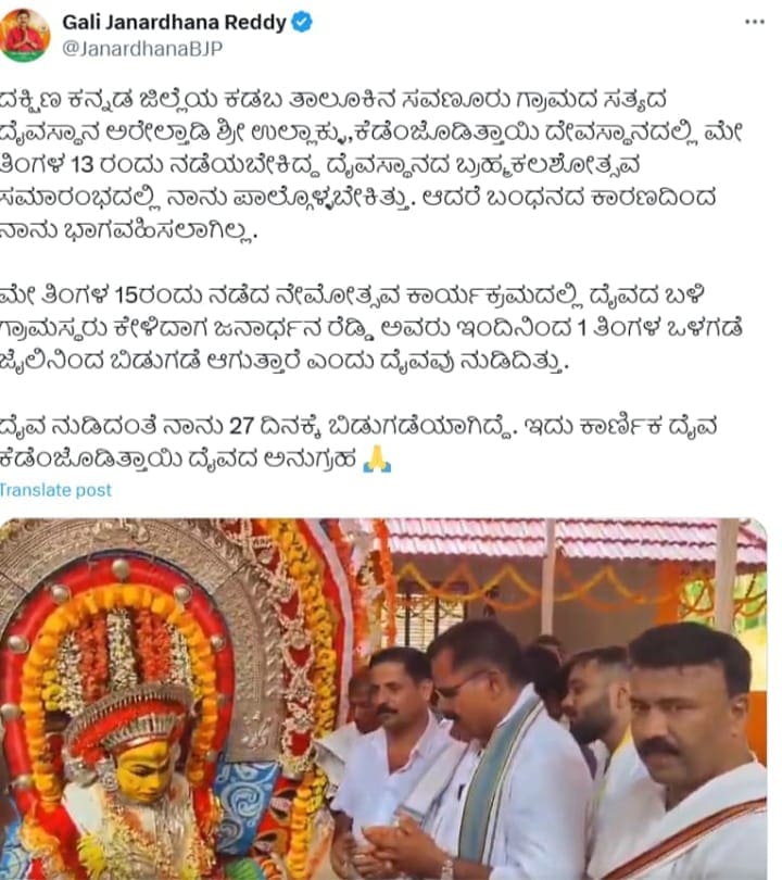 ಈಗ ದೈವದ ನುಡಿಯಂತೆ ಜೂ.11 ರಂದು ಜನಾರ್ದನ ರೆಡ್ಡಿಯವರು ಜೈಲಿನಿಂದ ಬಿಡುಗಡೆ ಹೊಂದಿದ್ದಾರೆ. ಈ ಕುರಿತು ಸೋಷಿಯಲ್ ಮೀಡಿಯಾದಲ್ಲಿ ಗಾಲಿ ಜನಾರ್ದನ ರೆಡ್ಡಿಯವರು ಈ ರೀತಿ ಶೇರ್ ಮಾಡಿದ್ದಾರೆ.