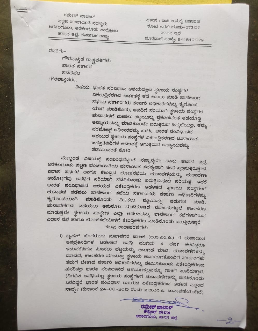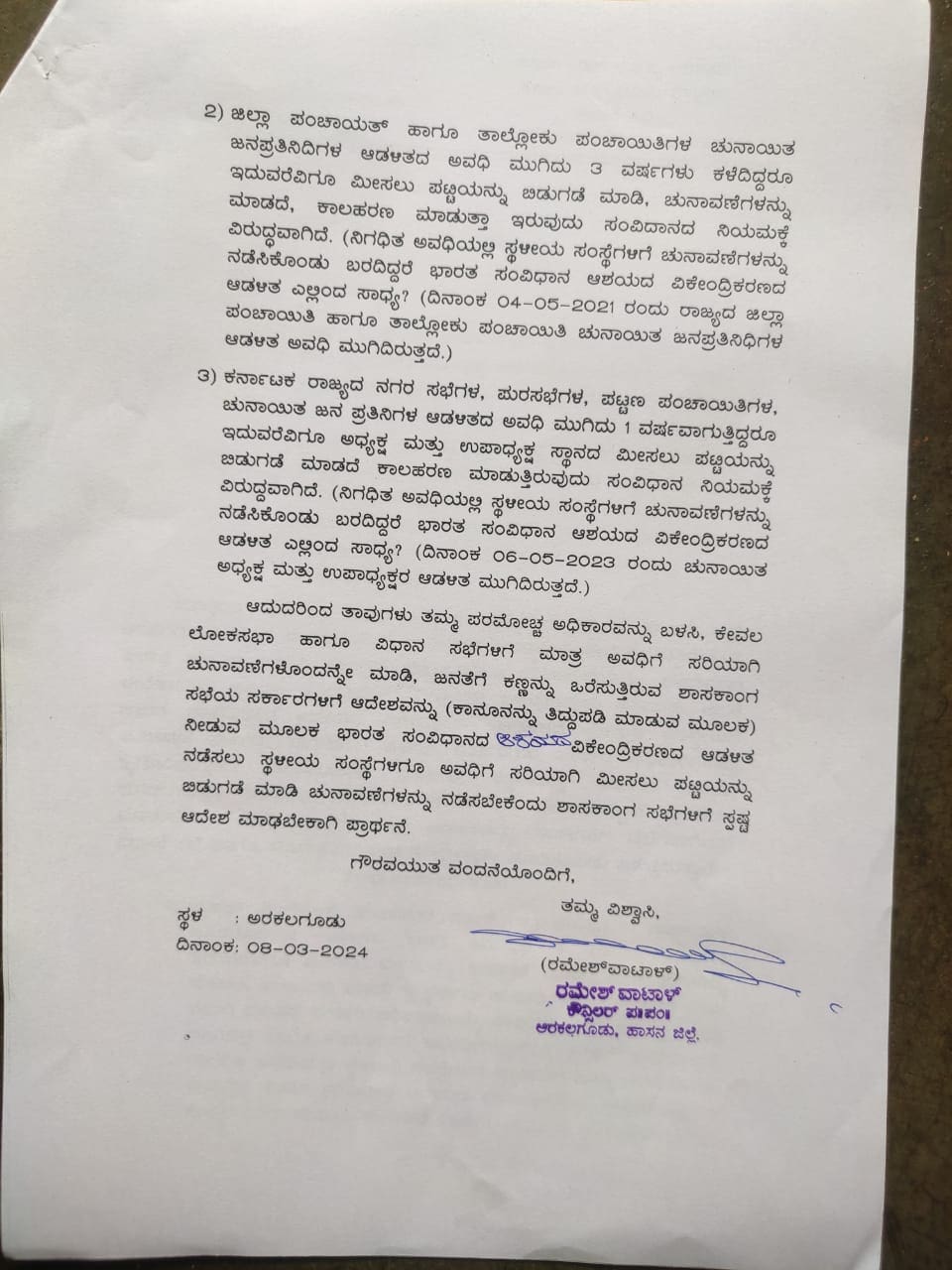 ಸ್ಥಳೀಯ ಸಂಸ್ಥೆಗಳಿಗೆ ನಿಗದಿತ ಅವಧಿಗೆ ಚುನಾವಣೆ ನಡೆಸುವ ಸಂಬಂಧ ಸೂಕ್ತ ಕಾನೂನು ಕ್ರಮ ಜರುಗಿಸುವಂತೆ ಸುಪ್ರೀಂ ಕೋರ್ಟ್ ಹಾಗೂ ರಾಷ್ಟ್ರಪತಿಗೆ ದೂರಿನ ಮನವಿ ಸಲ್ಲಿಸಲಾಗಿದೆ ಎಂದು ತಿಳಿಸಿದರು. ಈ ಕುರಿತು ಆಶಾದಾಯಕ ತೀರ್ಪು ಹೊರಬರುವ ವಿಶ್ವಾಸವಿದೆ ಎಂದು ಆಶಯ ವ್ಯಕ್ತ ಪಡಿಸಿದರು.