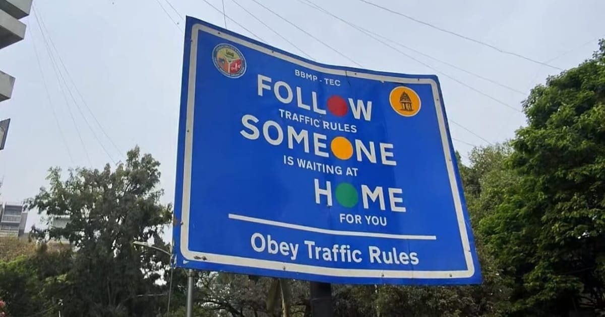 Traffic Sign Board: ಬೆಂಗಳೂರಿನ ಟ್ರಾಫಿಕ್ ಸೂಚನಾ ಫಲಕವು ರಸ್ತೆ ಸುರಕ್ಷತೆಯ ಬಗ್ಗೆ ಸಂದೇಶವನ್ನು ನೀಡುವುದಕ್ಕಾಗಿ ಬಳಸಿರುವ ನೂತನ ವಿಧಾನದಿಂದಾಗಿ ವೈರಲ್ ಆಗಿದೆ.