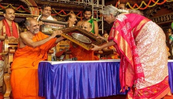 Udupi: ಶನಿವಾರ ಉಡುಪಿಯ (Udupi) ಶ್ರೀ ಕೃಷ್ಣ ಮಠದಲ್ಲಿ ನಡೆದ ವಿಶೇಷ ಸಮಾರಂಭದಲ್ಲಿ ಕೇಂದ್ರ ಹಣಕಾಸು ಸಚಿವೆ ನಿರ್ಮಲಾ ಸೀತಾರಾಮನ್ ಅವರಿಗೆ ಭಾರತ ಲಕ್ಷ್ಮಿ ಎಂಬ ಗೌರವ ಬಿರುದನ್ನು ಪ್ರದಾನ ಮಾಡಲಾಯಿತು.