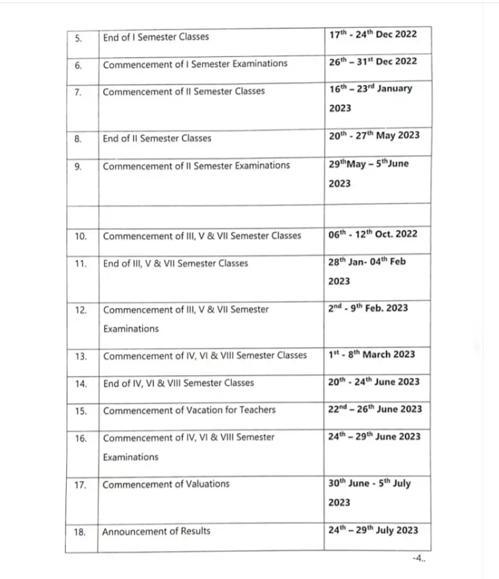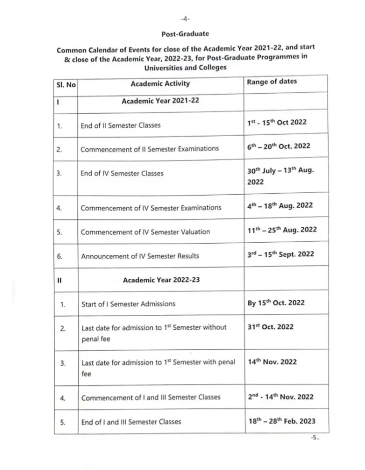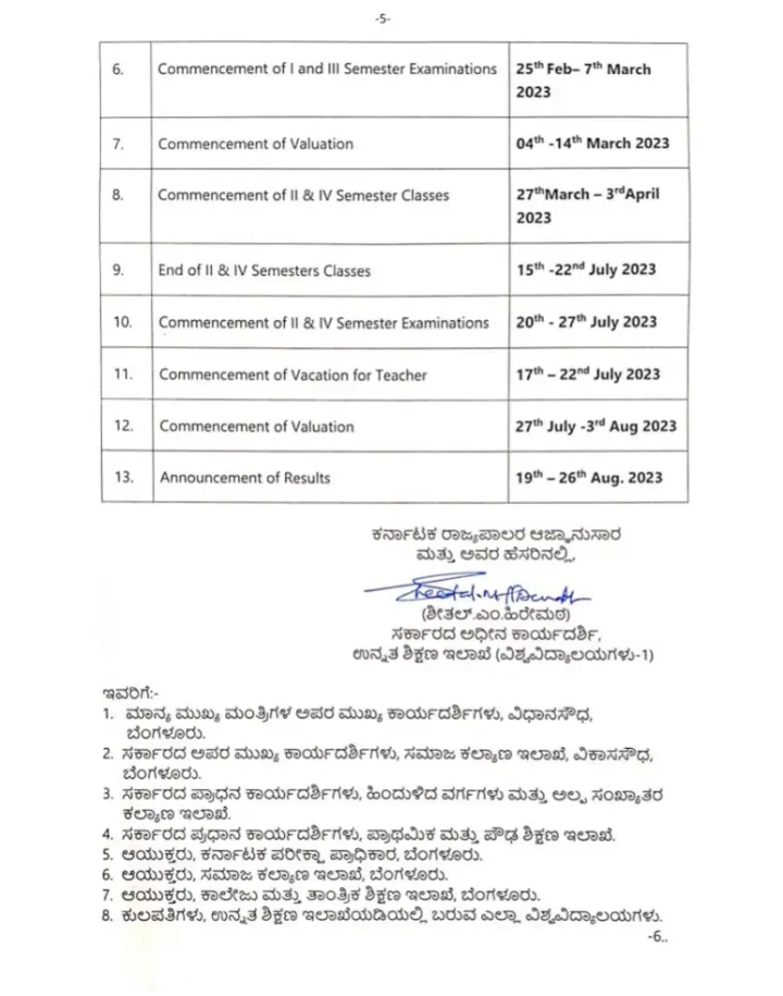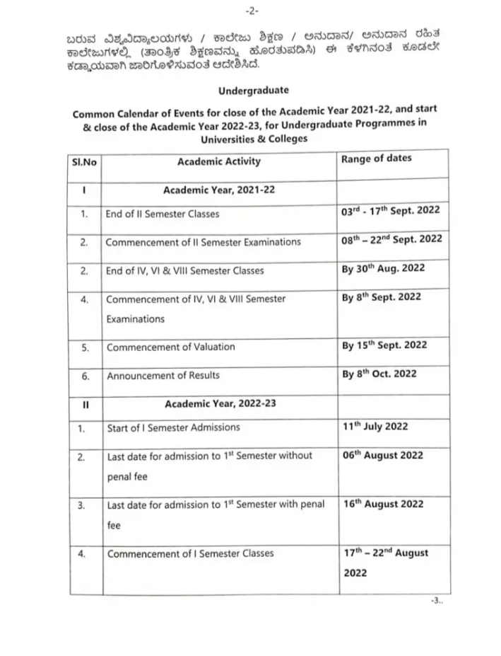 ಈ ಎಲ್ಲಾ ಹಿನ್ನಲೆಯಲ್ಲಿ 2022-23ನೇ ಸಾಲಿನ ಸ್ನಾತಕ, ಸ್ನಾತಕೋತ್ತರ ಶೈಕ್ಷಣಿಕ ವೇಳಾಪಟ್ಟಿಯನ್ನು ಉನ್ನತ ಶಿಕ್ಷಣ ಇಲಾಖೆಯಡಿಯಲ್ಲಿ ಬರುವ ವಿಶ್ವವಿದ್ಯಾಲಯಗಳು, ಕಾಲೇಜು ಶಿಕ್ಷಣ, ಅನುದಾನ, ಅನುದಾನ ರಹಿತ ಕಾಲೇಜುಗಳಲ್ಲಿ ಜಾರಿಗೊಳಿಸಲಾಗುತ್ತಿದೆ. ಈ ಕೆಳಕಂಡಂತೆ ಒಂದೇ ಶೈಕ್ಷಣಿಕ ವೇಳಾಪಟ್ಟಿಯನ್ನು ಜಾರಿಗೊಳಿಸಲು ಆದೇಶಿಸಿದ್ದಾರೆ.