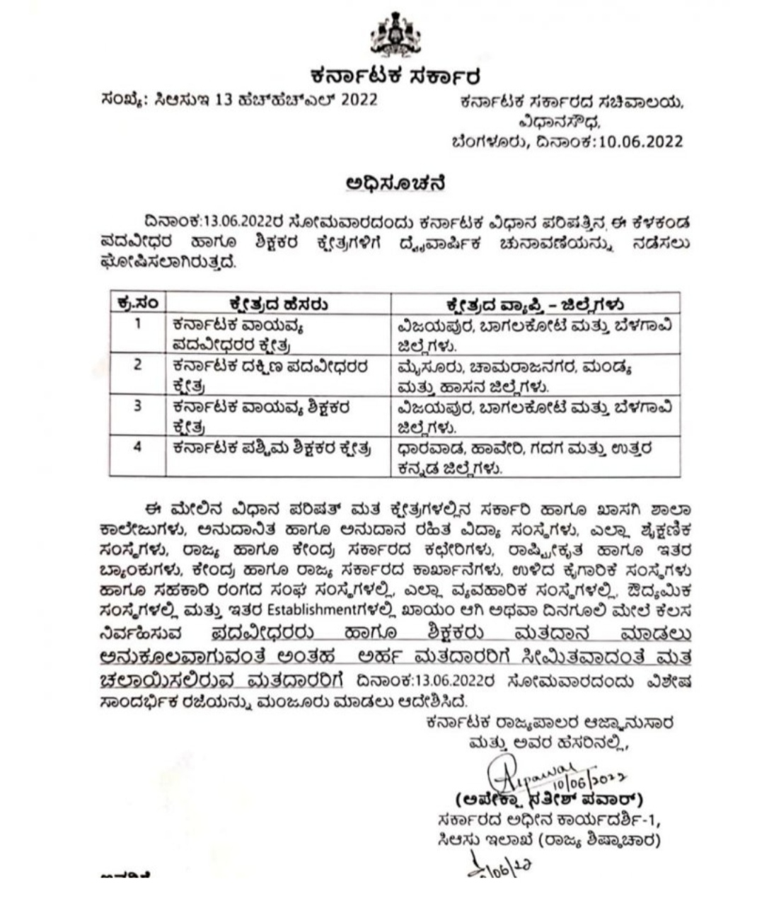ವಿಧಾನ ಪರಿಷತ್ತಿನ ವಾಯವ್ಯ ಪದವೀಧರ, ದಕ್ಷಿಣ ಪದವೀಧರ, ವಾಯವ್ಯ ಶಿಕ್ಷಕರು ಹಾಗೂ ಪಶ್ಚಿಮ ಶಿಕ್ಷಕರ ಮತ ಕ್ಷೇತ್ರಗಳಲ್ಲಿ ಚುನಾವಣೆ 13-06-2022 ರಂದು ನಡೆಯಲಿದ್ದು, ಹೀಗಾಗಿ ರಾಜ್ಯ ಸರ್ಕಾರದ ಅಧೀನ ಕಾರ್ಯದರ್ಶಿ ಅಂದು ಶಾಲೆಗೆ ರಜೆಘೋಷಿಸಿದ್ದಾರೆ.