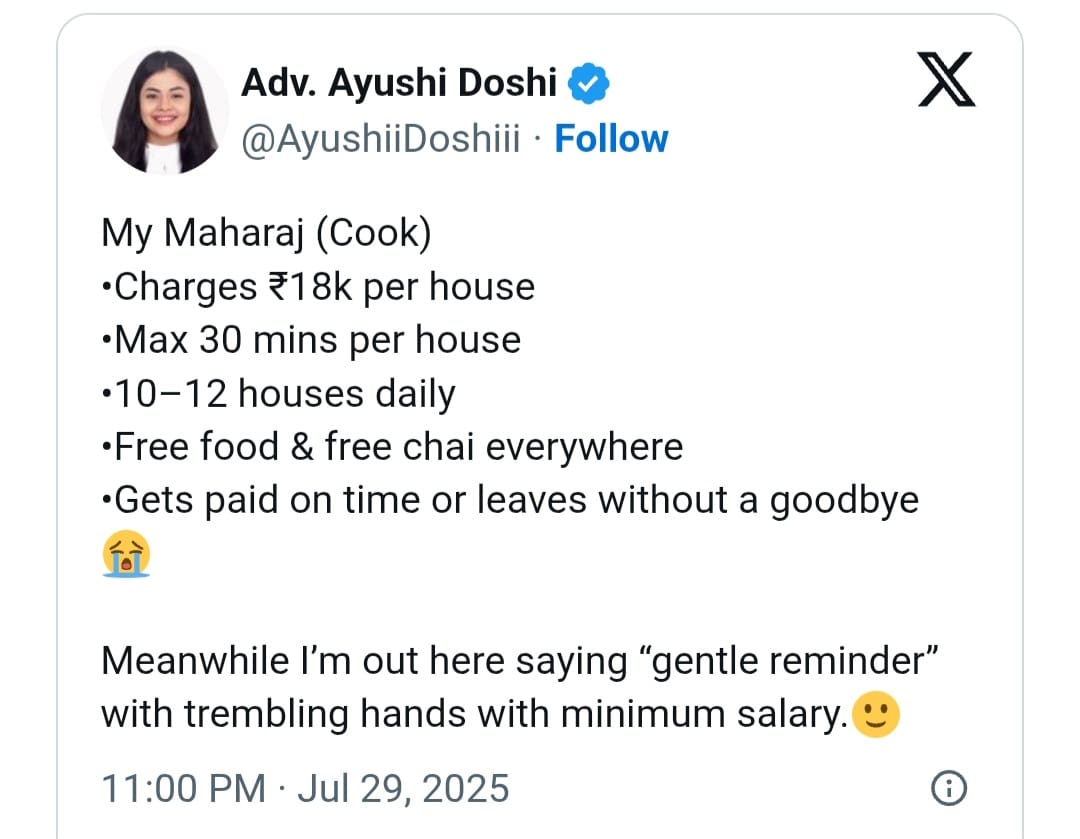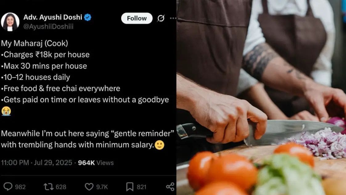 ಅಂದಹಾಗೆ @AyushiiDoshii ಹೆಸರಿನ ಎಕ್ಸ್ ಖಾತೆಯಲ್ಲಿ ಮಹಿಳೆಯೊಬ್ಬರು ತಮ್ಮ ಮನೆಗೆ ಬರುವ ಅಡುಗೆಯವ ತಿಂಗಳಿಗೆ ಎಷ್ಟು ಸಂಪಾದನೆ ಮಾಡ್ತಾನೆ ಎಂದು ಈ ಪೋಸ್ಟ್ನಲ್ಲಿ ತಿಳಿಸಿದ್ದಾರೆ. ನನ್ನ ಮಹಾರಾಜ್ (ಅಡುಗೆಯವ)’ ಪ್ರತಿ ದಿನ ಅರ್ಧ ಗಂಟೆ ಕೆಲಸ ಮಾಡುತ್ತಾನೆ. ತಿಂಗಳಿಗೆ 18,000 ರೂ ಪಡೆಯುತ್ತಾರೆ . ಹೀಗೆ ಹತ್ತು ಹನ್ನೆರಡು ಮನೆಗಳಲ್ಲಿ ಪ್ರತಿದಿನ ಕೆಲಸ ಮಾಡುತ್ತಾರೆ. ಉಚಿತ ಊಟ ಚಹಾ ಸಿಗುತ್ತದೆ. ಒಂದು ವೇಳೆ ಸರಿಯಾಗಿ ಸಂಬಳ ಕೊಡದ್ದಿದರೆ ವಿದಾಯ ಹೇಳದೇ ಹೊರಟು ಹೋಗುತ್ತಾರೆ ಎಂದು ಇಲ್ಲಿ ಬರೆಯಲಾಗಿದೆ.