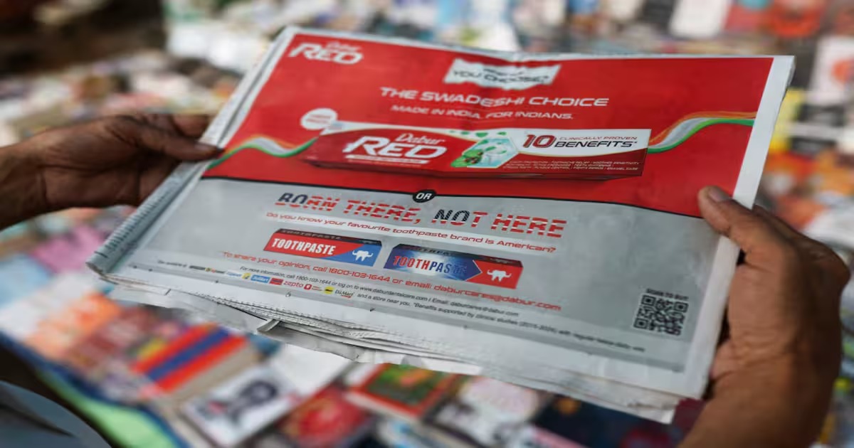 $11 ಬಿಲಿಯನ್ ಮೌಲ್ಯದ ಗ್ರಾಹಕ ಸರಕುಗಳ ಕಂಪನಿ ಡಾಬರ್, ಈ ವಾರ ಕೋಲ್ಗೇಟ್ ಪ್ಯಾಕೇಜಿಂಗ್ ಅನ್ನು ಹೋಲುವ ಬ್ರಾಂಡ್ ಮಾಡದ ಟೂತ್ಪೇಸ್ಟ್ ಪ್ಯಾಕ್ಗಳ ಫೋಟೋಗಳನ್ನು ಹೊಂದಿರುವ ಮುಖಪುಟದ ಜಾಹೀರಾತನ್ನು ನೀಡಿದೆ. ಅದರ ಪ್ರತಿಸ್ಪರ್ಧಿಯನ್ನು ಹೆಸರಿಸದೆ, ಭಾರತದ ನೆಚ್ಚಿನ ಟೂತ್ಪೇಸ್ಟ್ ಬ್ರ್ಯಾಂಡ್ ಅಮೇರಿಕನ್ ಮತ್ತು ಡಾಬರ್ “ಸ್ವದೇಶಿ” ಆಯ್ಕೆಯಾಗಿದೆ ಎಂದು ಜಾಹೀರಾತು ಹೇಳಿದೆ.